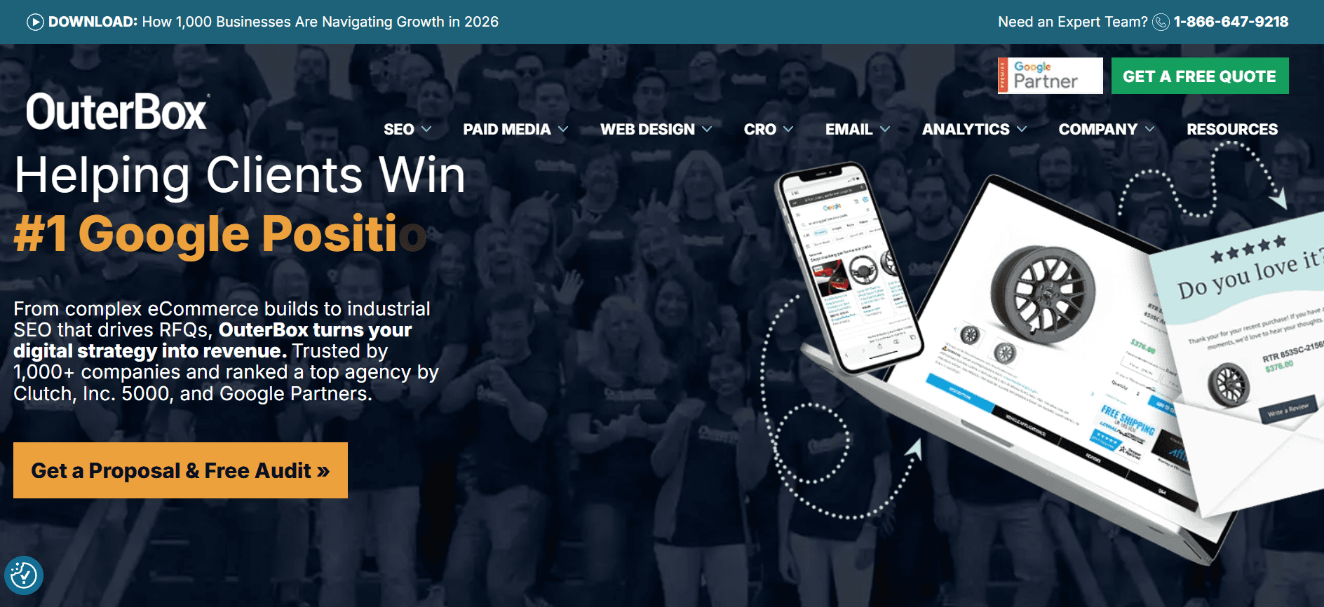 OuterBox has over two decades of ecommerce-specific SEO experience and a team of 240+ specialists. Their strength is technical SEO at enterprise scale, including complex site architecture optimization, crawl budget management for large catalogs, and advanced analytics integration. They align SEO with UX and CRO, making them a strong choice for enterprise retailers.