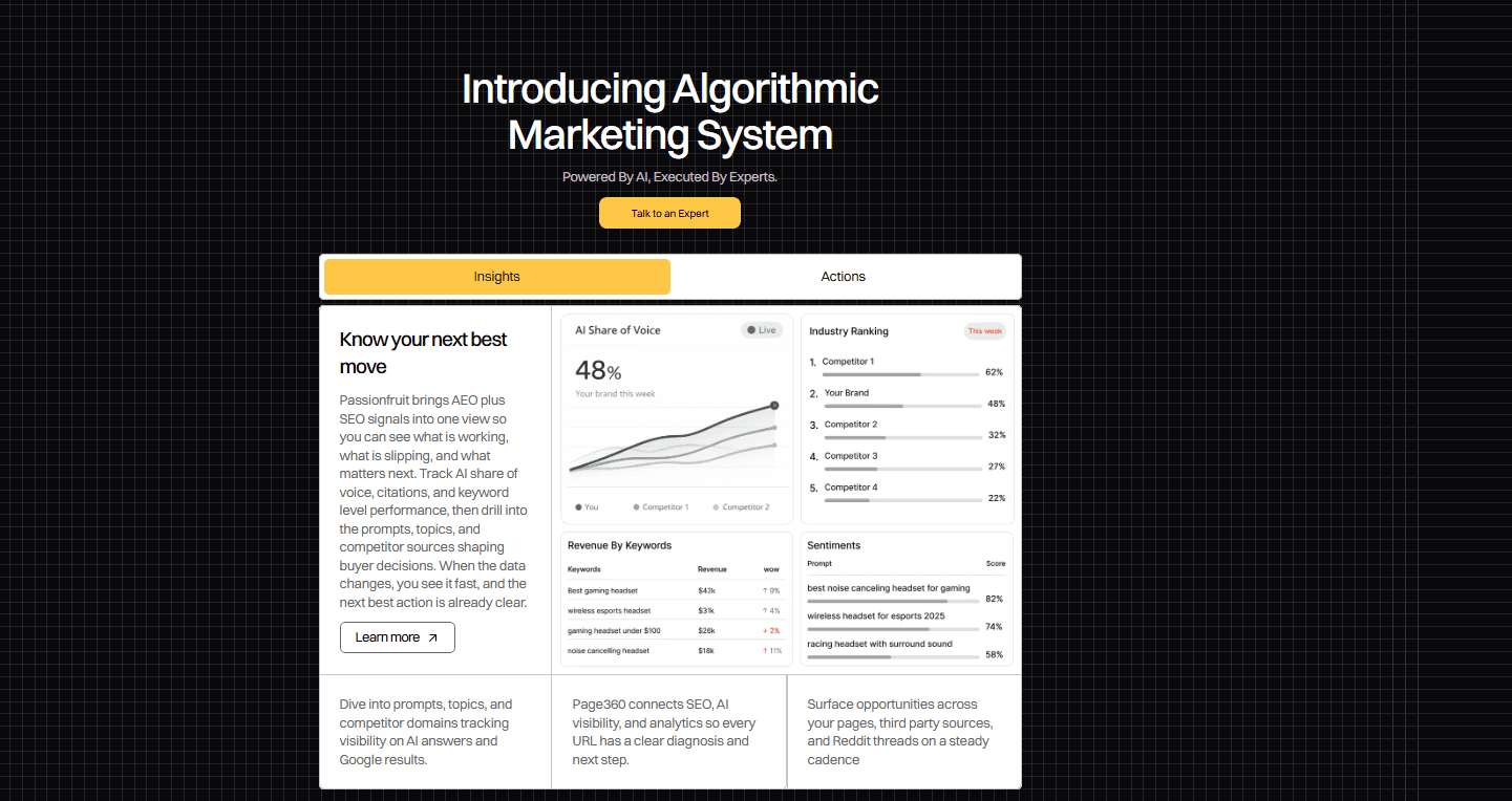 Passionfruit is an AI-native SEO and growth engine built for the generative search era. Where most ecommerce agencies are retrofitting AI capabilities onto traditional SEO workflows, Passionfruit was designed around Generative Engine Optimization from the ground up.