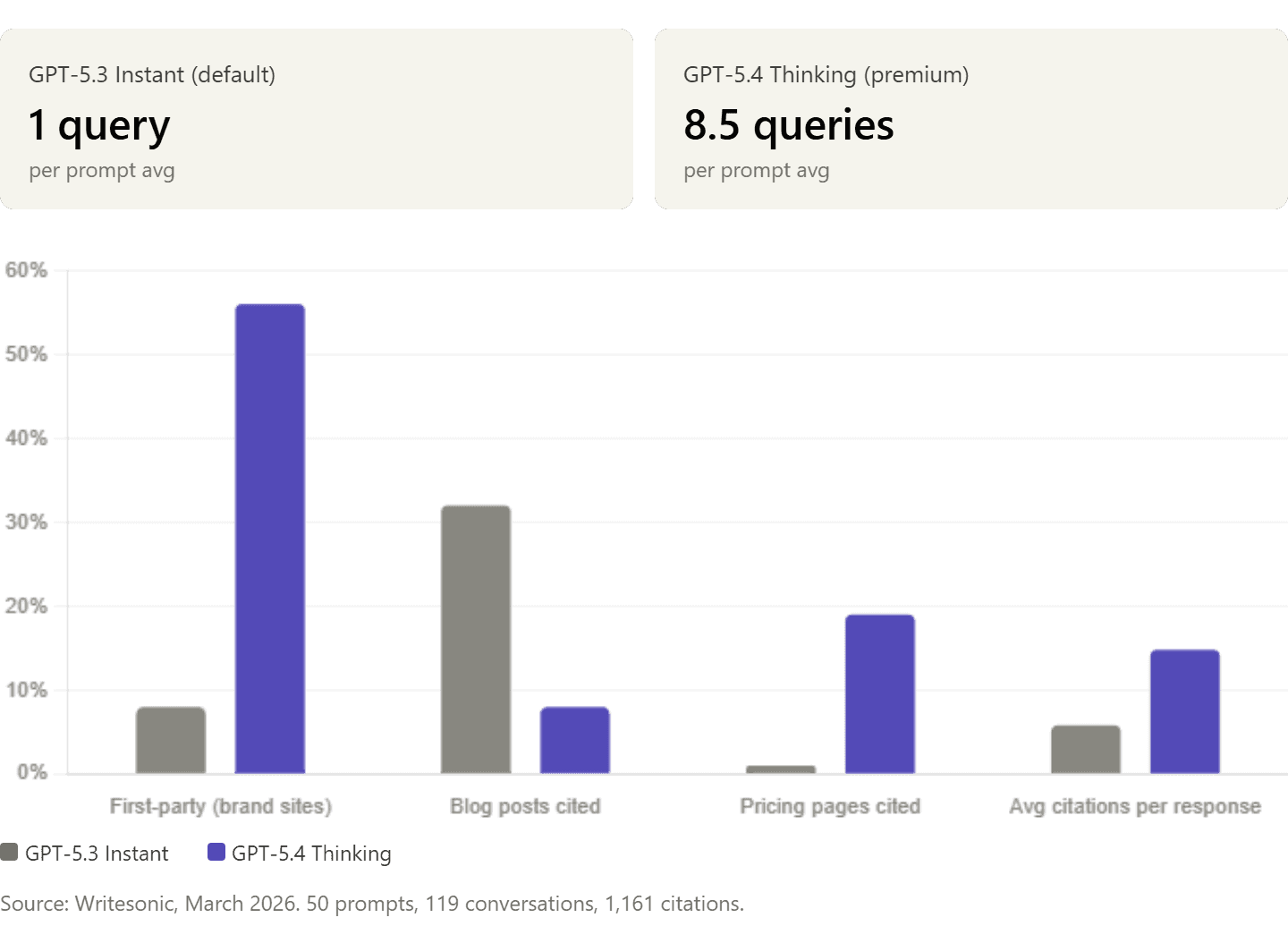 Writesonic's March 2026 study of 50 prompts across ChatGPT's newest models found that GPT-5.4 Thinking skipped search on 4 of 50 prompts. But GPT-5.4 still cited 17 sources from training data alone on a robot vacuum prompt. GPT-5.3 produced zero citations when it did not search.