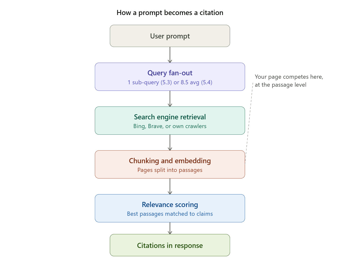 Citations are attached to passages that survived every pipeline stage: query decomposition, search ranking, chunk extraction, embedding similarity, and relevance scoring. A page can rank on Google for a keyword and still not appear in ChatGPT's citations if the model decomposed the prompt into sub-queries your page does not address.