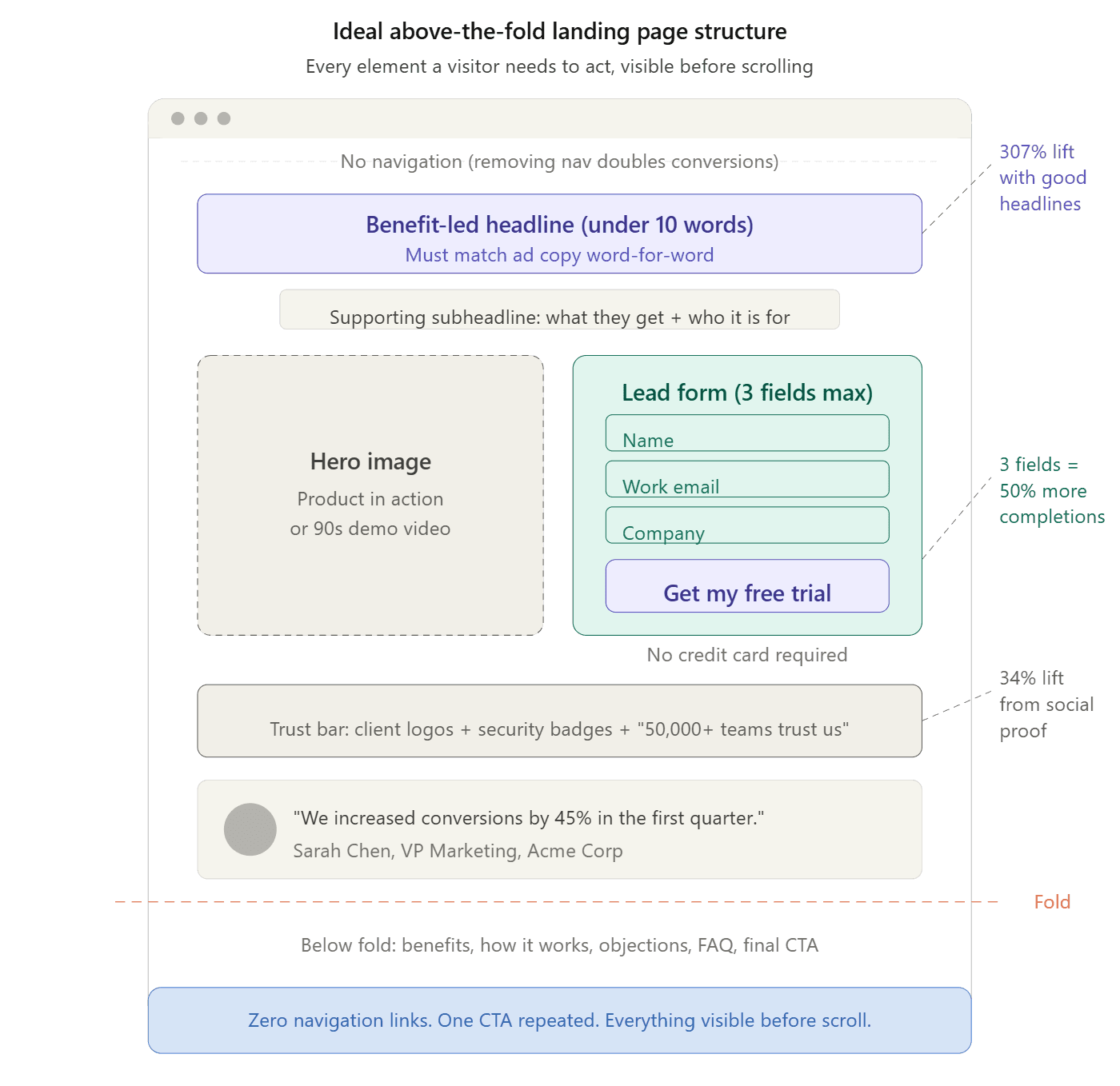 Reducing form fields from four to three boosts conversion rates by up to 50%. The most effective three-field combination is first name, email, and one qualifying question (company name for B2B, or product interest for B2C).