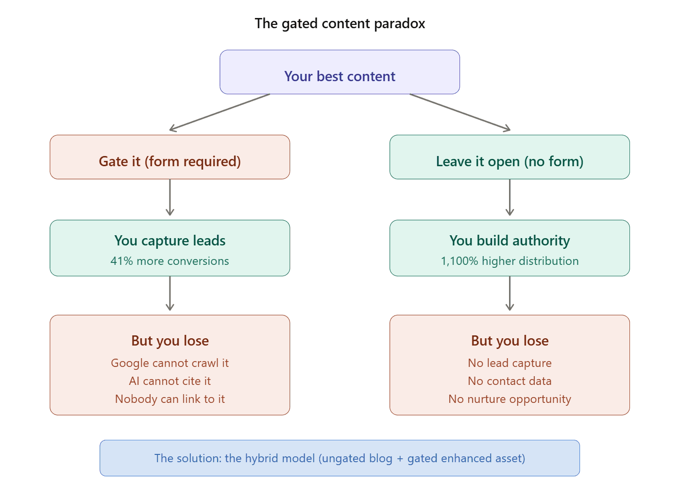 The solution is not "gate everything" or "ungate everything." It is a decision framework that tells you exactly which content to gate, which to leave open, and how to use a hybrid approach that captures leads without sacrificing the SEO and AI search visibility that feeds your funnel in the first place.