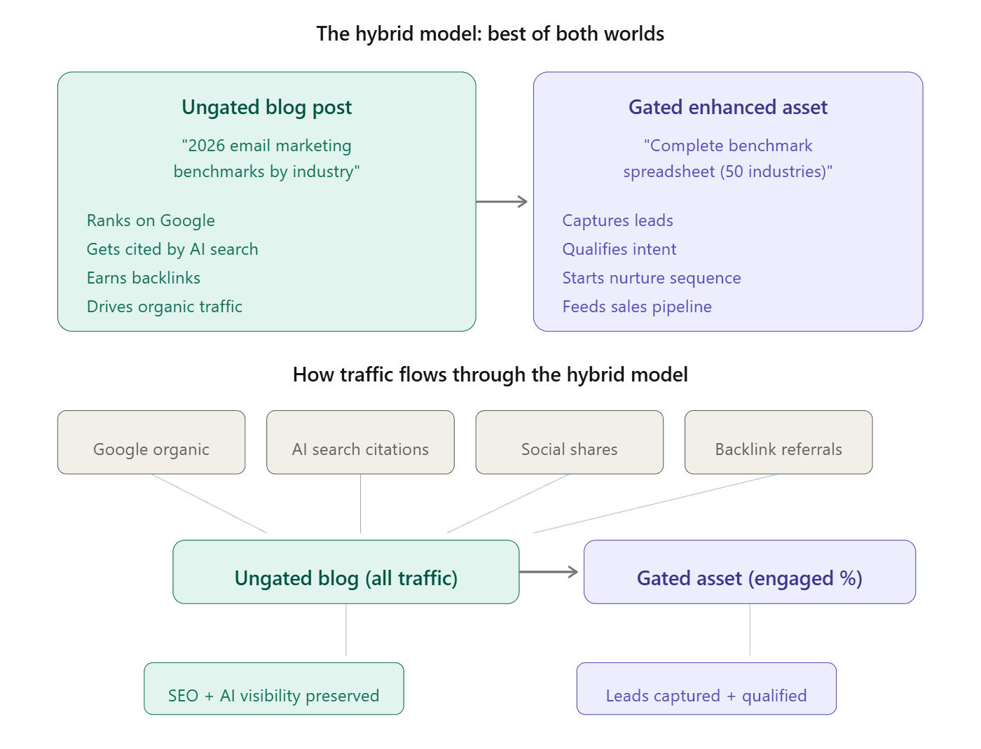 Example: Publish a detailed blog post on "2026 Email Marketing Benchmarks by Industry" (ungated, ranks for SEO, gets cited by AI). At the bottom and in a sidebar, offer a downloadable "Complete Email Marketing Benchmark Spreadsheet with 50 Industry Breakdowns" (gated). The blog post drives traffic. The downloadable asset captures leads. You get both.