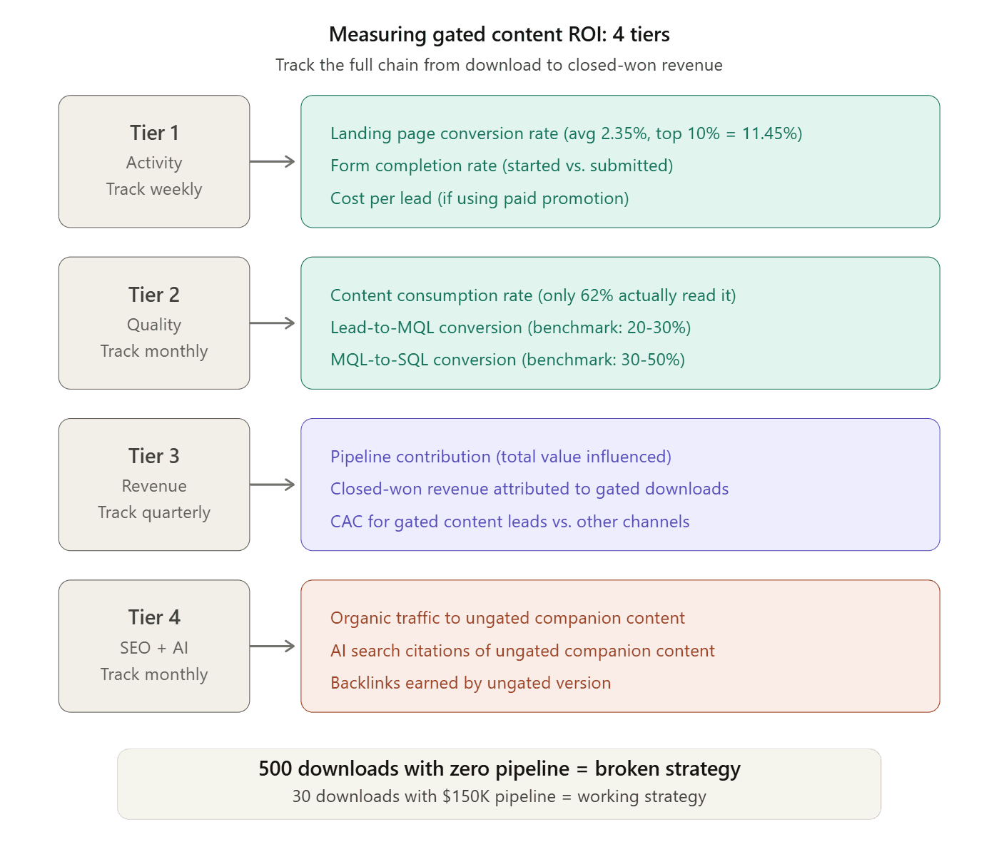 Track the full chain: downloads, content consumption rate, lead-to-MQL conversion, MQL-to-SQL conversion, pipeline value influenced, and closed-won revenue. If your gated asset generates 500 downloads but zero pipeline contribution, the content or the follow-up sequence needs fixing.