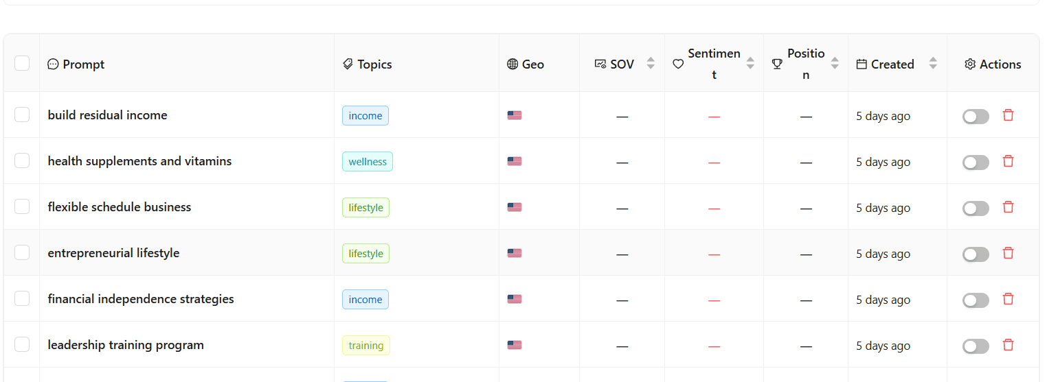 For instance, you might monitor prompts like "build residual income," "health supplements and vitamins," or "flexible schedule business." These represent actual user intent, not just keywords. Passionfruit's prompt monitoring system tracks whether AI platforms cite your content, where you rank in those citations, and how sentiment shifts over time, all while connecting visibility changes directly to pipeline impact and revenue metrics.