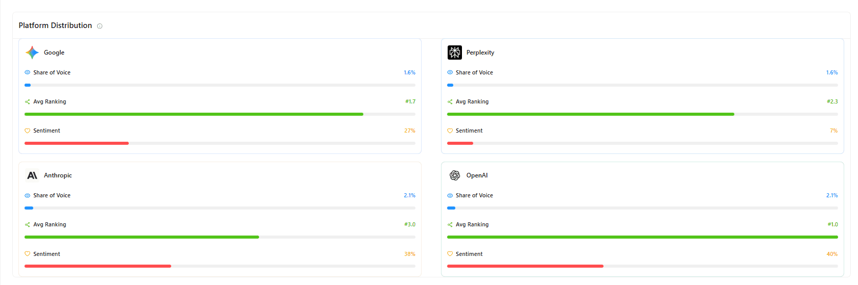 One enterprise SaaS company discovered that while their share of voice was growing, 68% of their mentions occurred in negative contexts related to a product issue from three years ago. Without sentiment monitoring, they would have celebrated increased visibility while their brand reputation deteriorated across AI platforms.