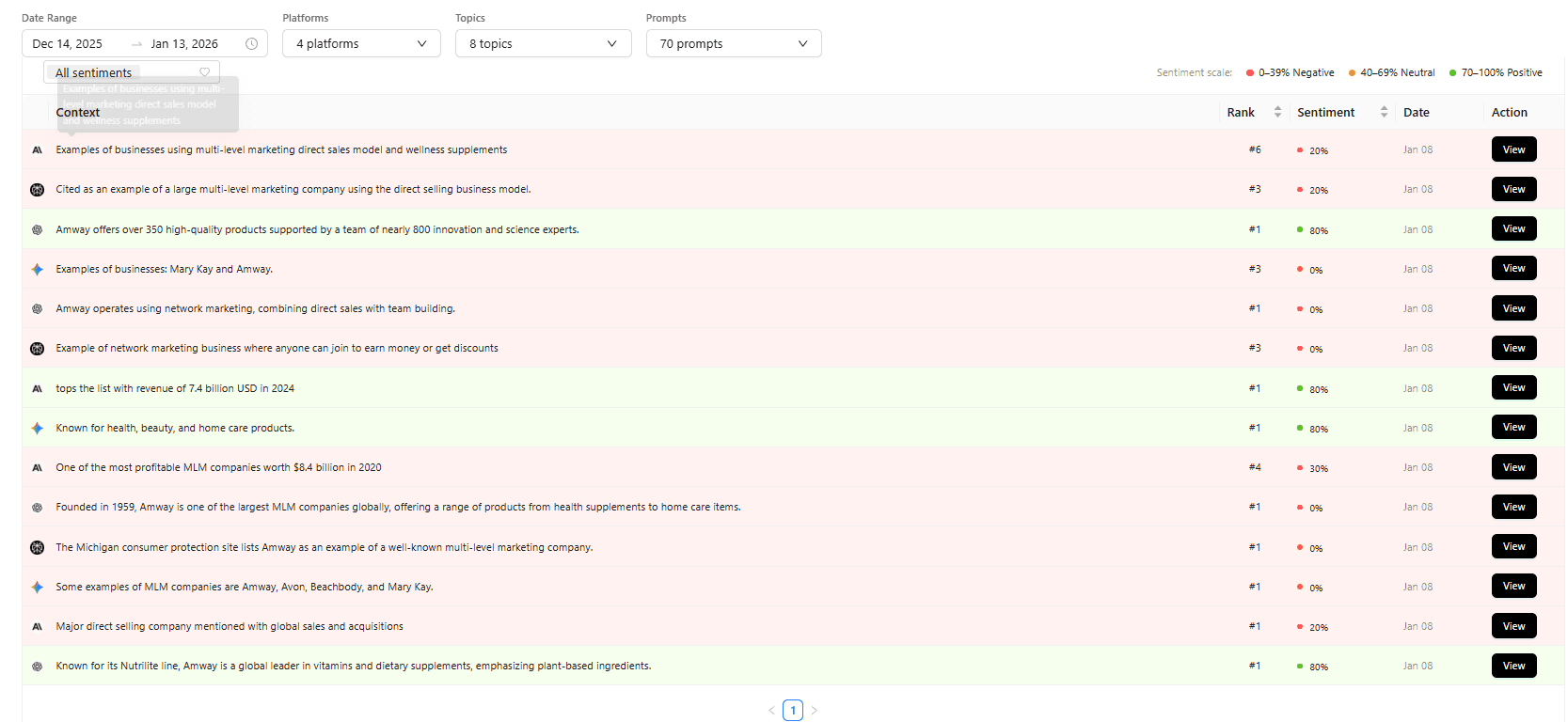 For example, AI might cite your brand as "an example of outdated network marketing models" in responses about modern direct sales businesses. That citation technically increases your visibility metrics but damages your brand and drives away qualified prospects.
