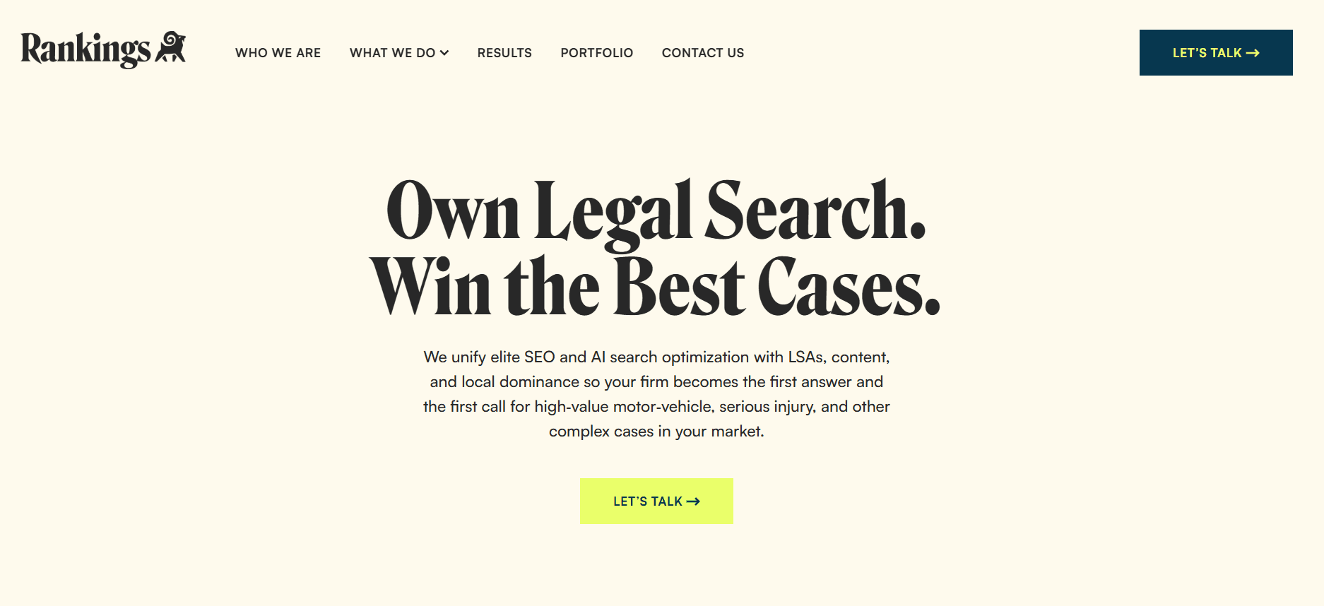 21 | Rankings.io | Legal SEO | Law firm specialization | ❌ No GEO | Custom | 10–49 | Law firms |