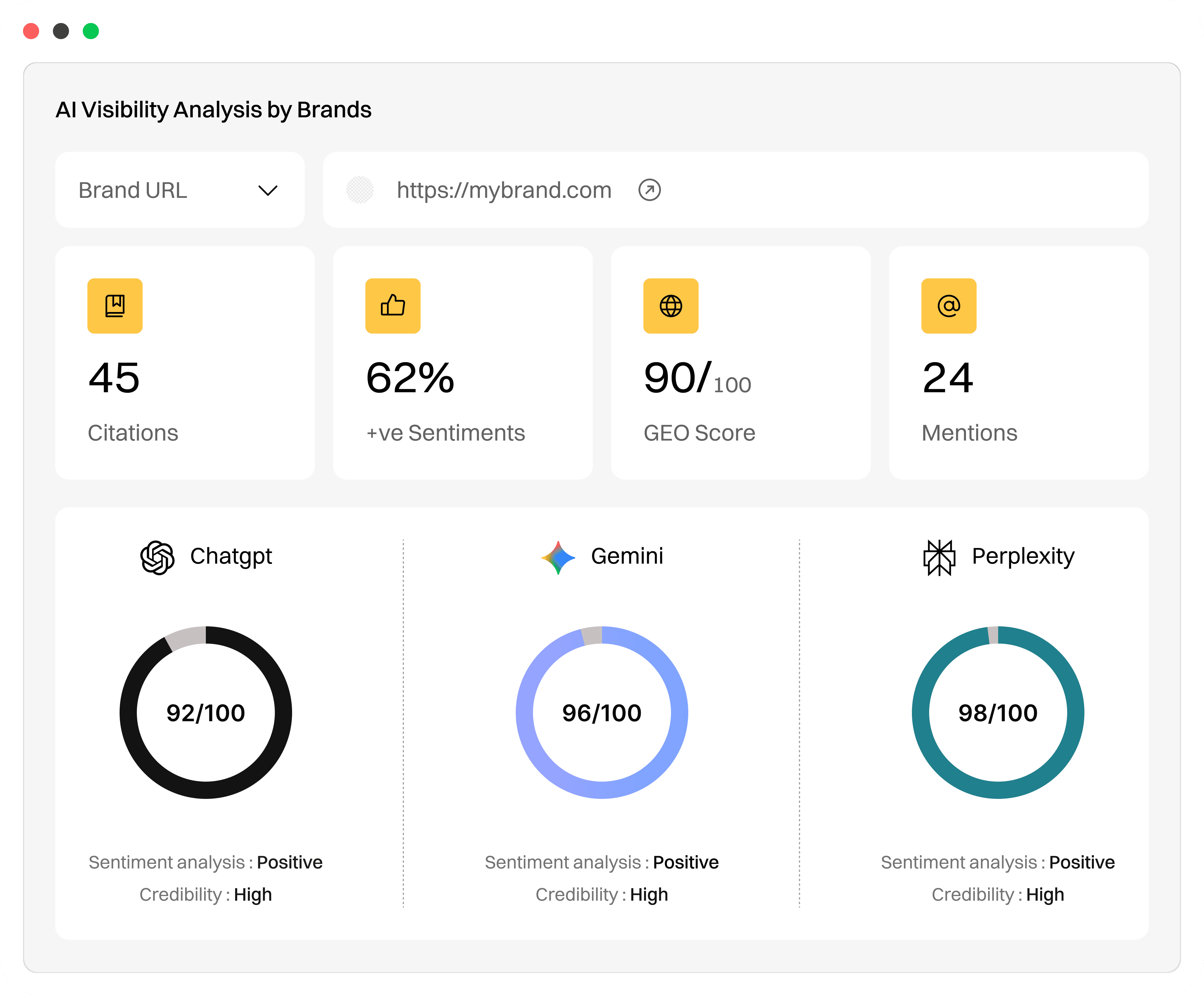 Monitor how ChatGPT, Gemini, Claude Perplexity, and AI Overviews mention, rank, and recommend your brand - in real time.