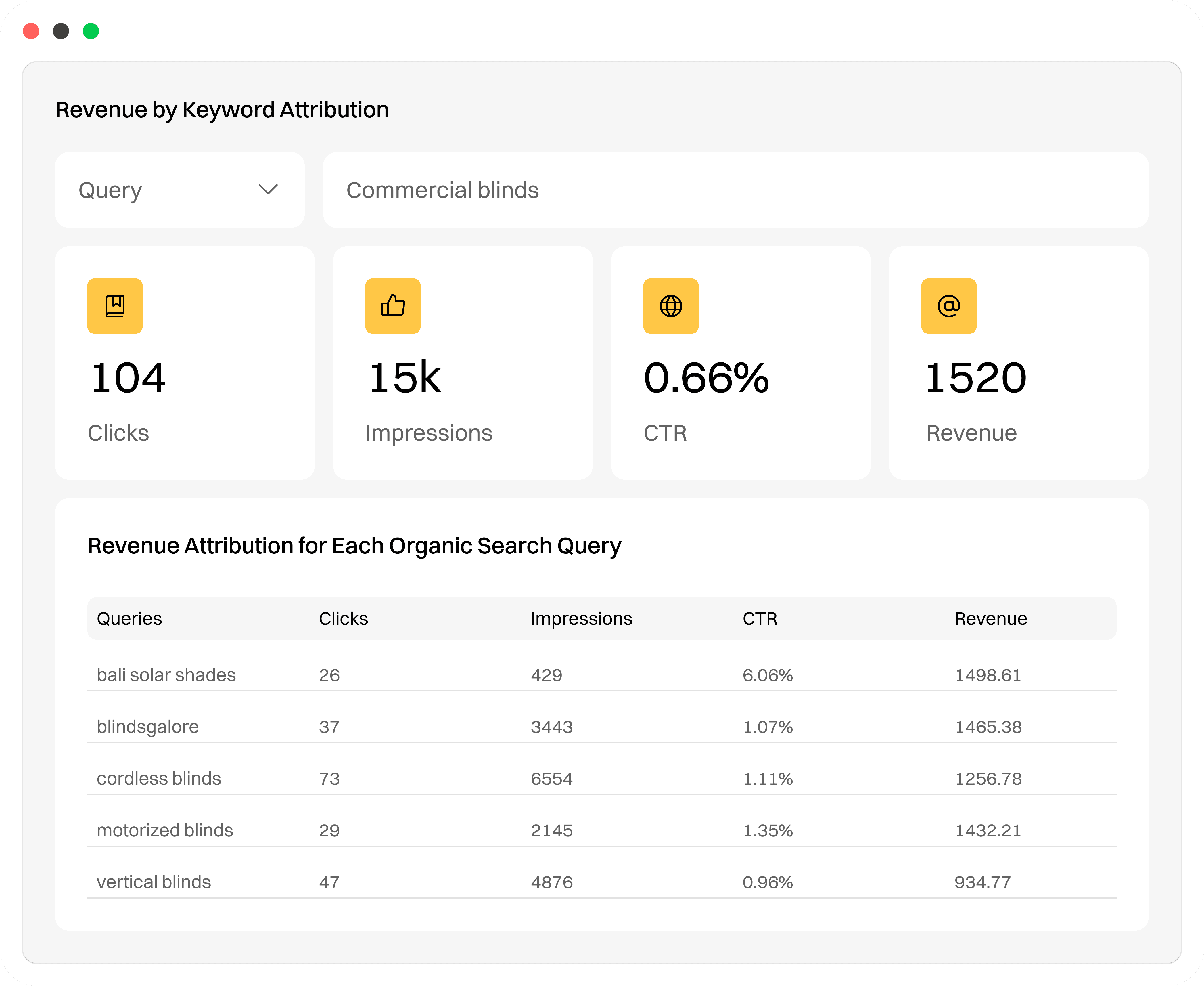 Every tracked keyword is tied to downstream revenue, not just clicks. See which rankings generate pipeline and which generate noise.