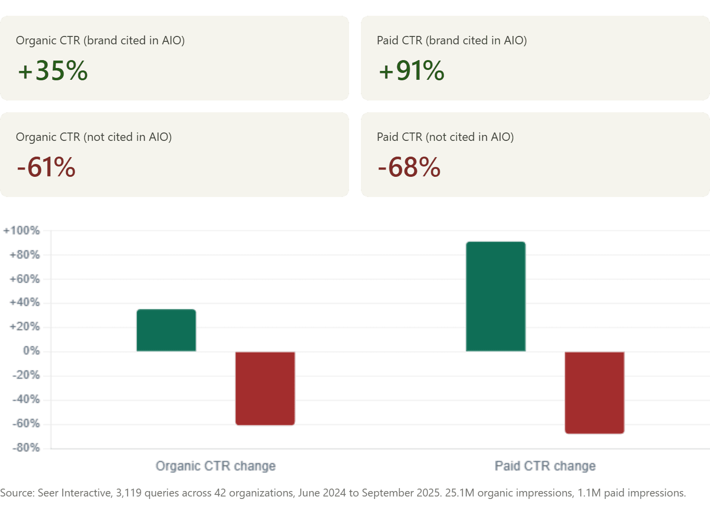 Seer Interactive (2025). AI Overview CTR Impact Study. 3,119 queries, 42 organizations.