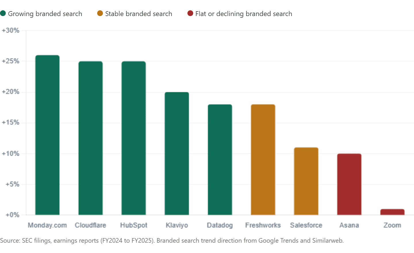 The pattern is directionally clear. Companies with growing branded search interest (Monday.com at +26% revenue, Cloudflare at +25%, HubSpot at ~25%) are growing revenue faster than companies with flat or declining branded search interest (Zoom at +1%, Asana at +10%).