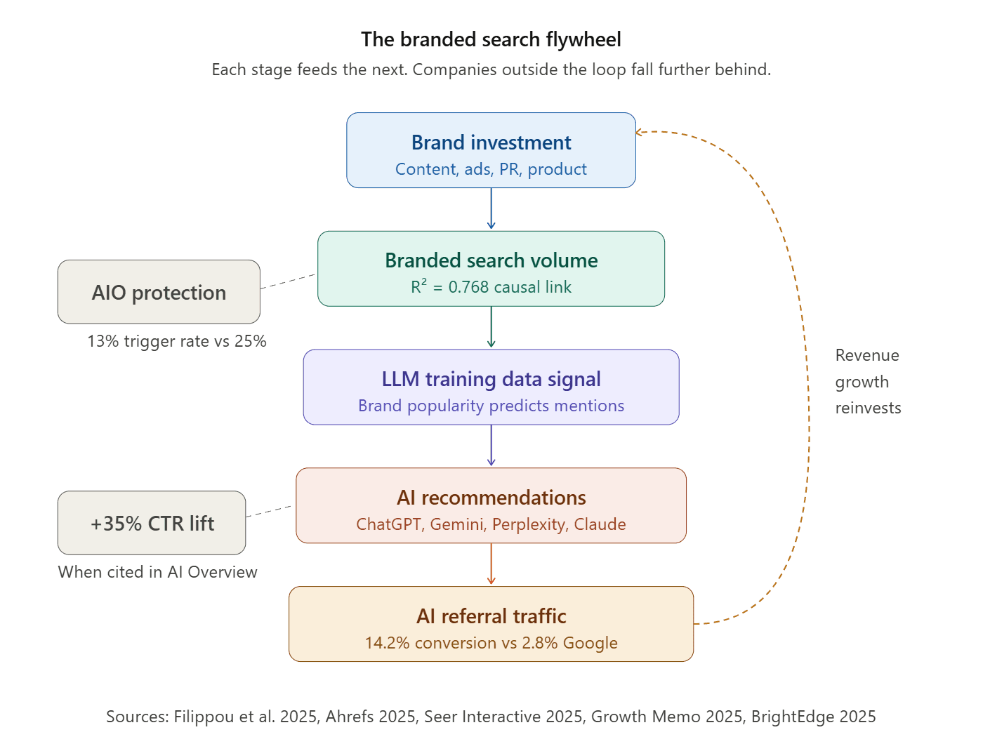 Brand investment → Branded search volume → LLM training data → AI recommendations → AI referral traffic (14.2% conversion rate vs. Google's 2.8%) → Revenue growth → Reinvestment in brand