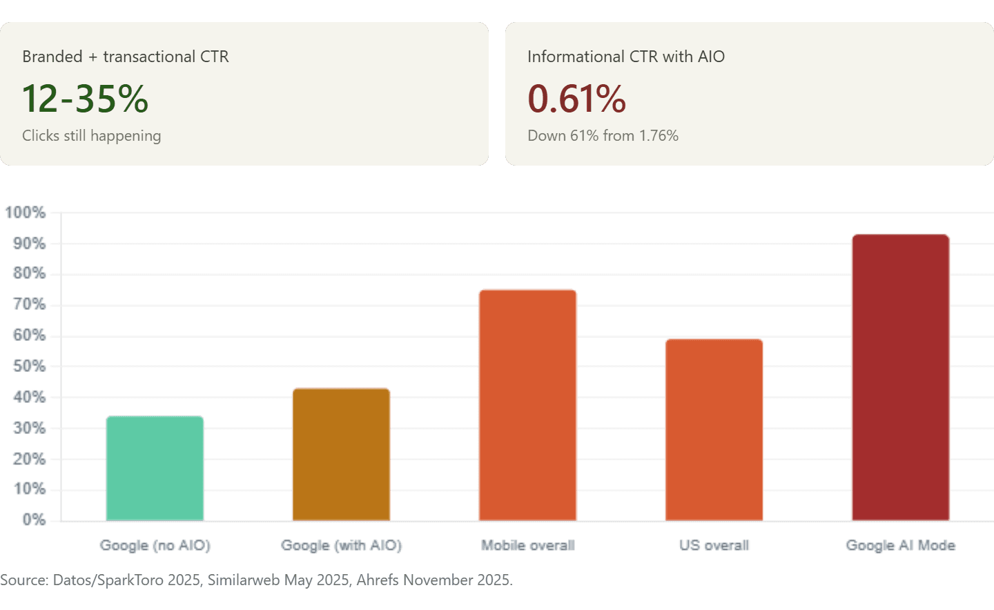 Branded + transactional queries | 65-88% still click | Ahrefs/Similarweb, 2025 |