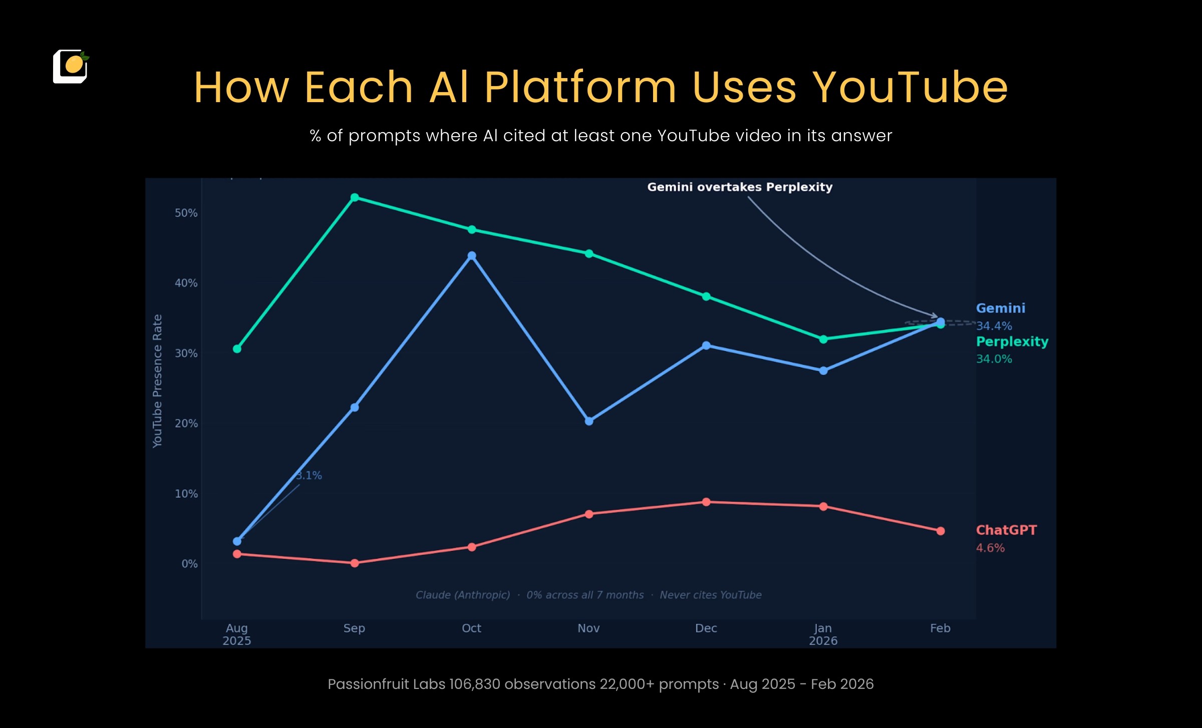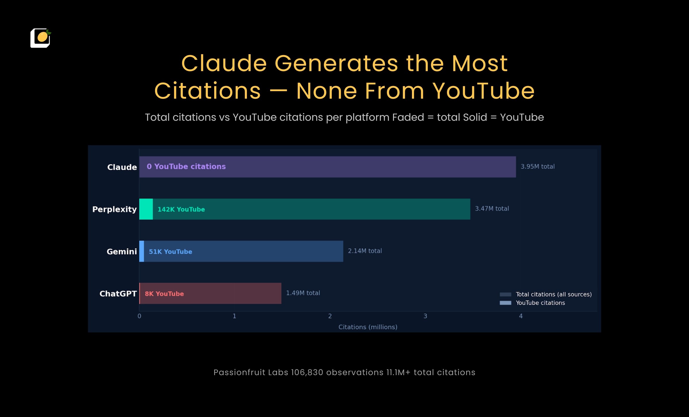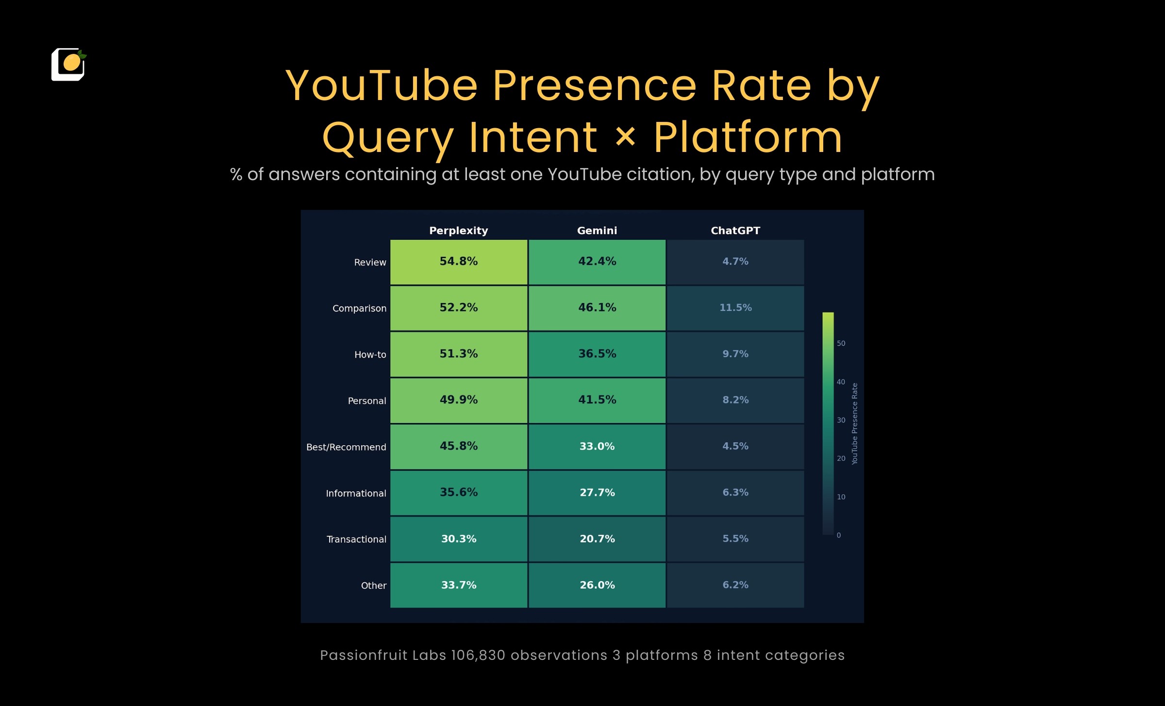 Over the last seven months, we at Passionfruit tracked 21 million AI answers to understand how each engine treats YouTube as an evidence source. The gap between platforms is not marginal. There is a 40× difference between platforms that changes strategy depending on where your audience searches.