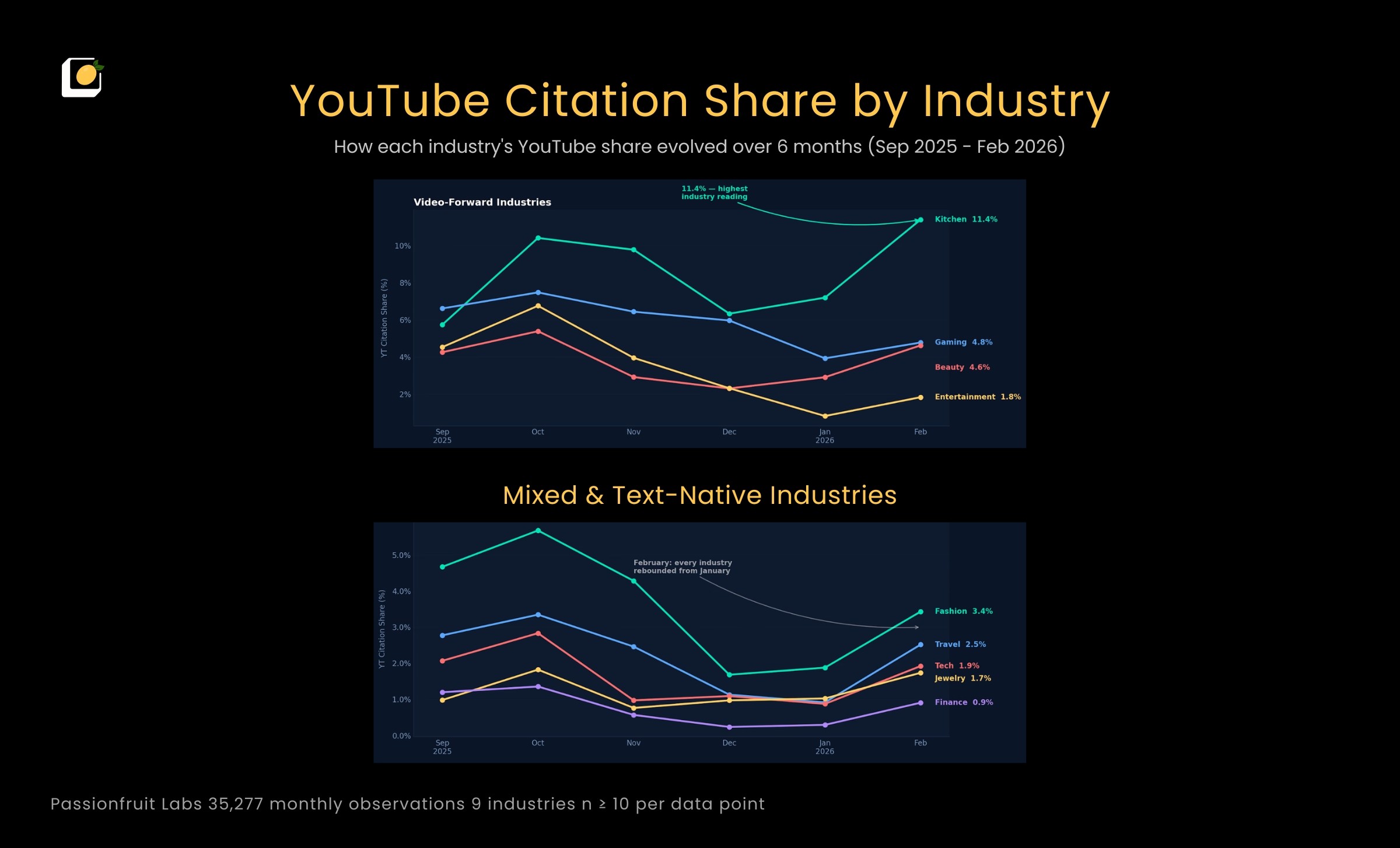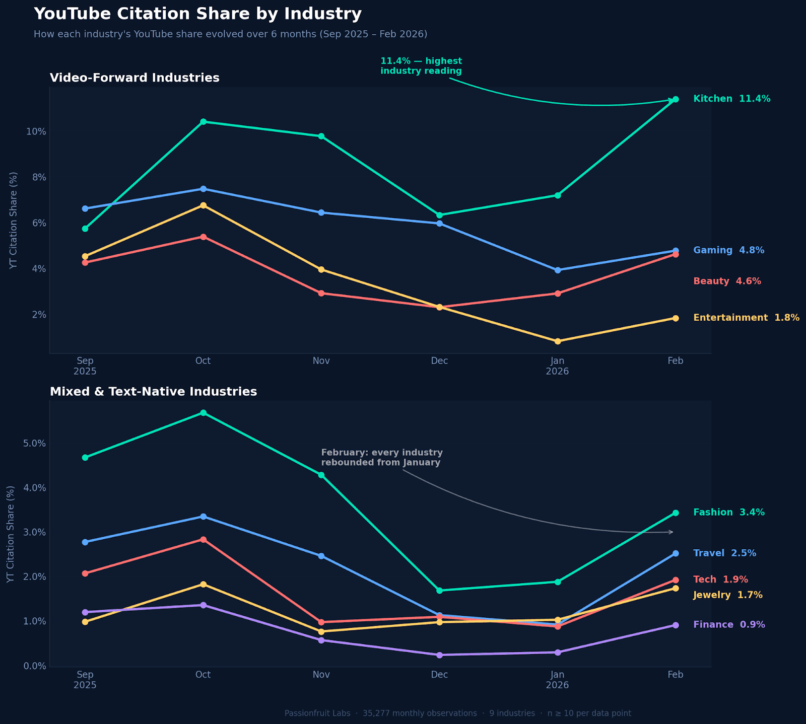 Kitchen Appliances surged to 11.5% YouTube presence share in February, the highest single-industry reading in the dataset.