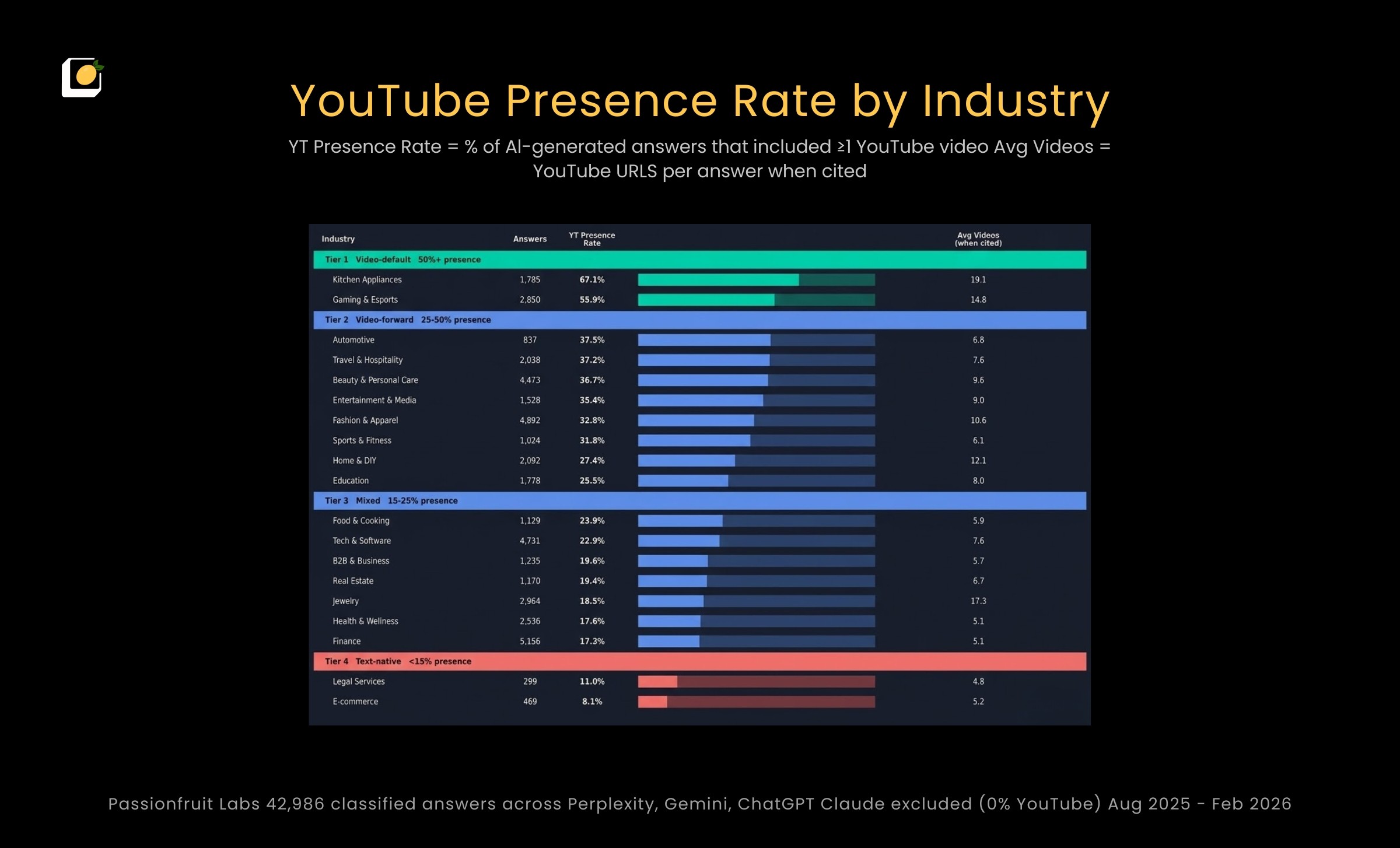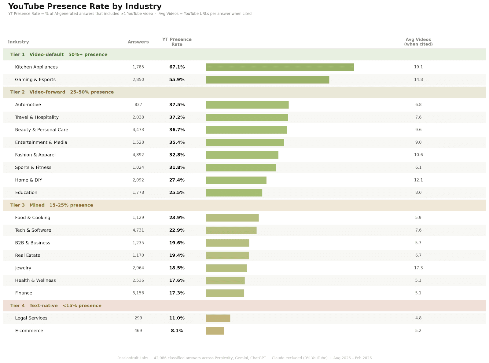 Tier 1: Video-default (85%+ presence rate). D2C Athleisure (95.7%), Woodworking (97.6%), Gaming & Esports (90.4%). In these industries, AI treats video as the expected evidence format. Nearly every answer includes YouTube.