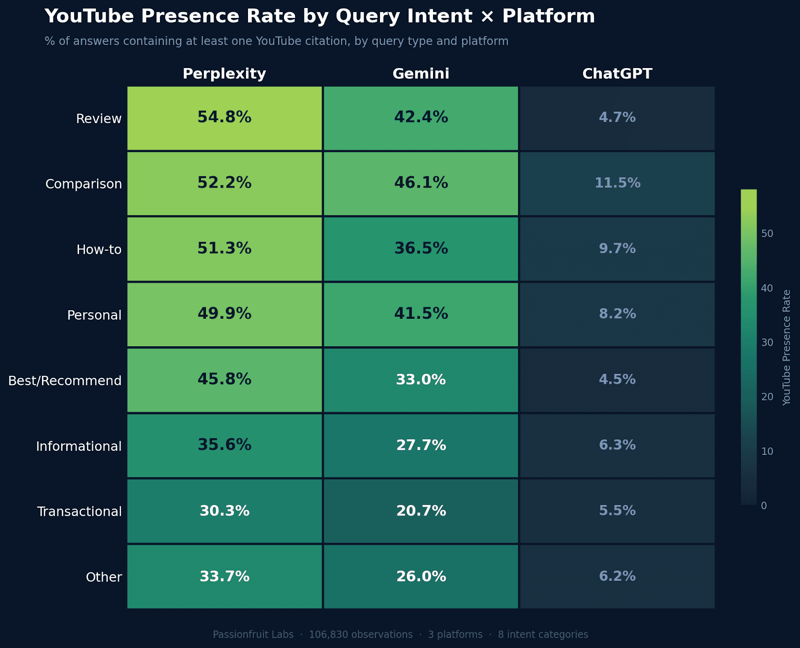 The same query types trigger YouTube across all platforms, but at dramatically different presence rates.