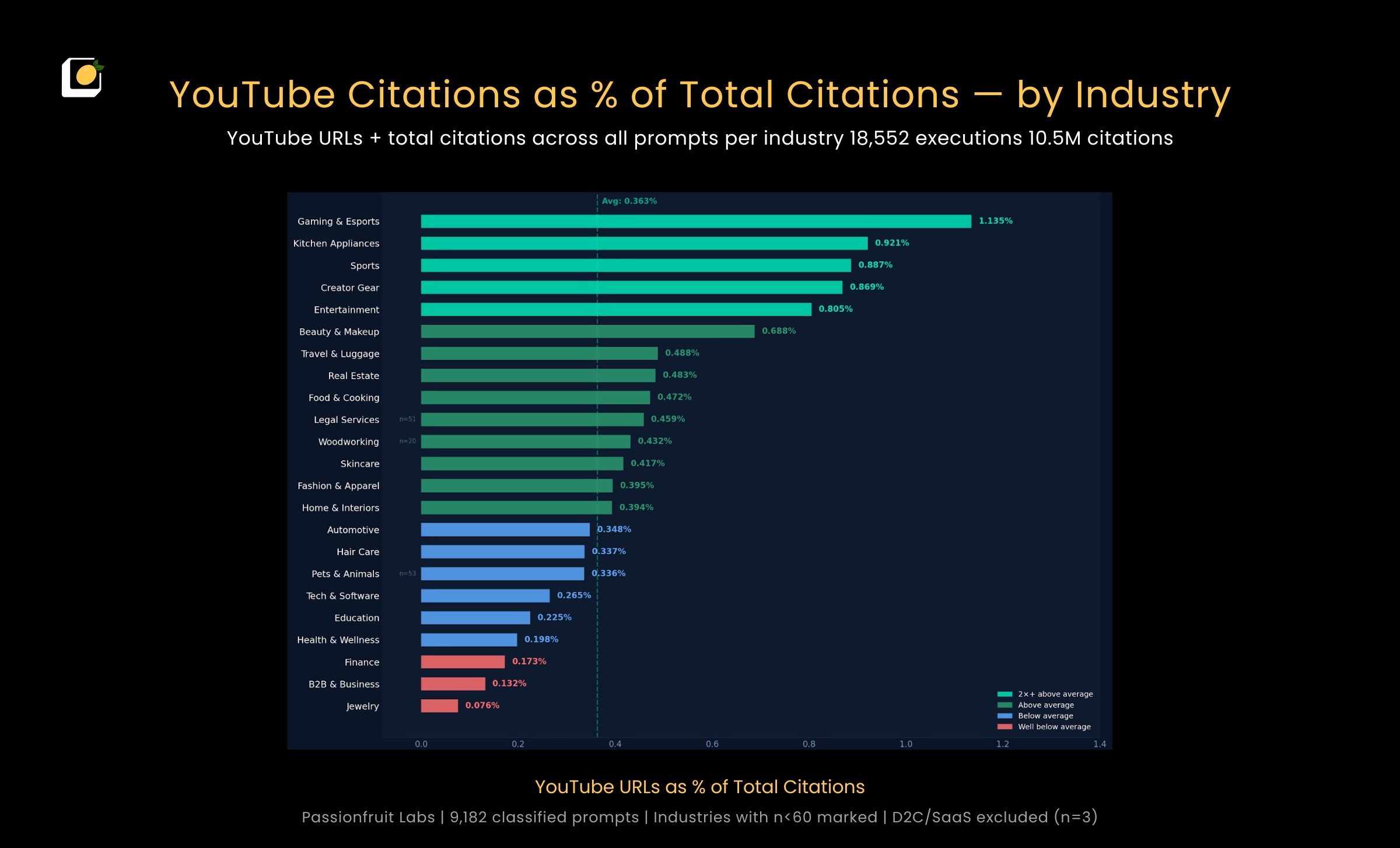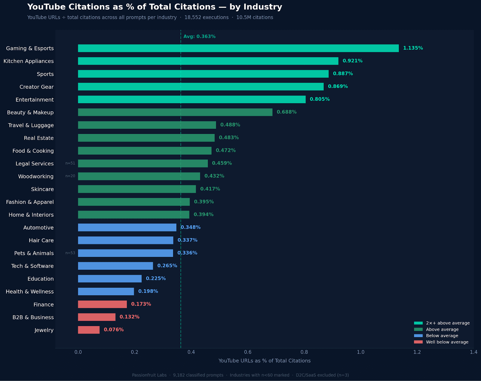 Industry decides how much YouTube matters in your AI answers. The gap between the highest and lowest industries is 65.6 percentage points wider than any other variable in the dataset.