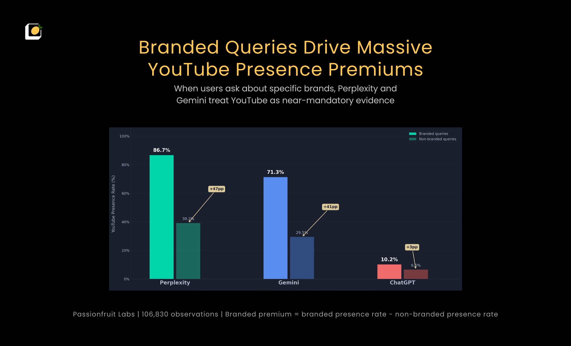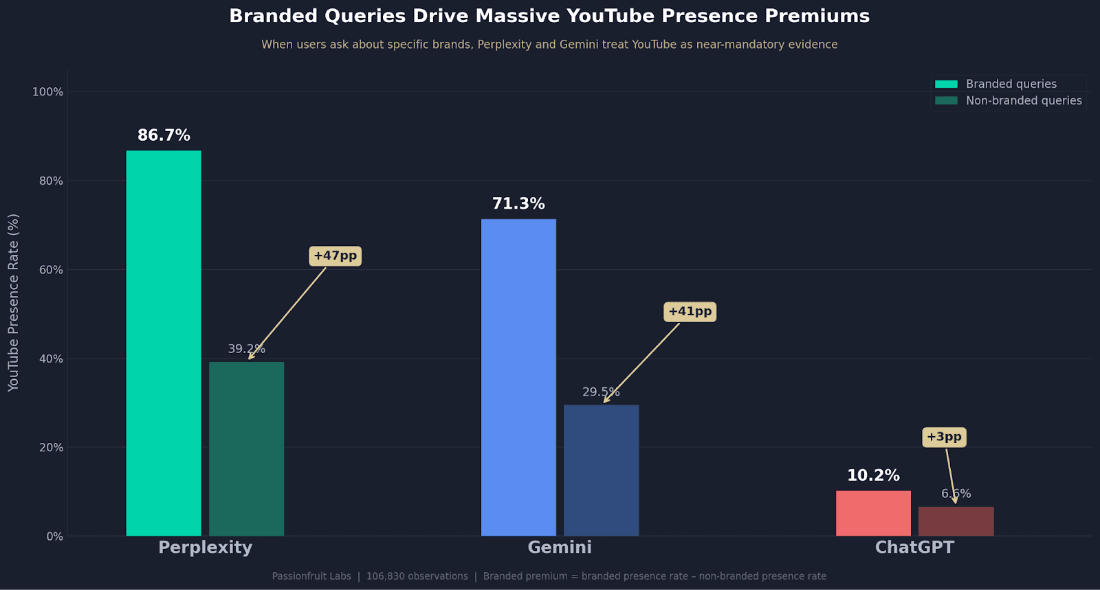 Branded queries produce a significant presence rate lift on Perplexity and Gemini. When someone asks about a specific brand, Perplexity's YouTubepresence rate jumps from 39.2% to 86.7%, a 47.6 percentage point increase. Gemini jumps from 29.5% to 71.3%, a 41.8 percentage point increase. ChatGPT barely responds to this signal, moving from 6.6% to 10.2%.