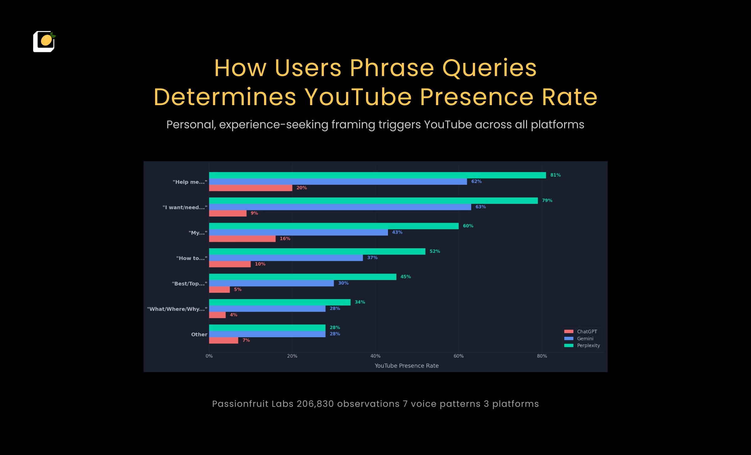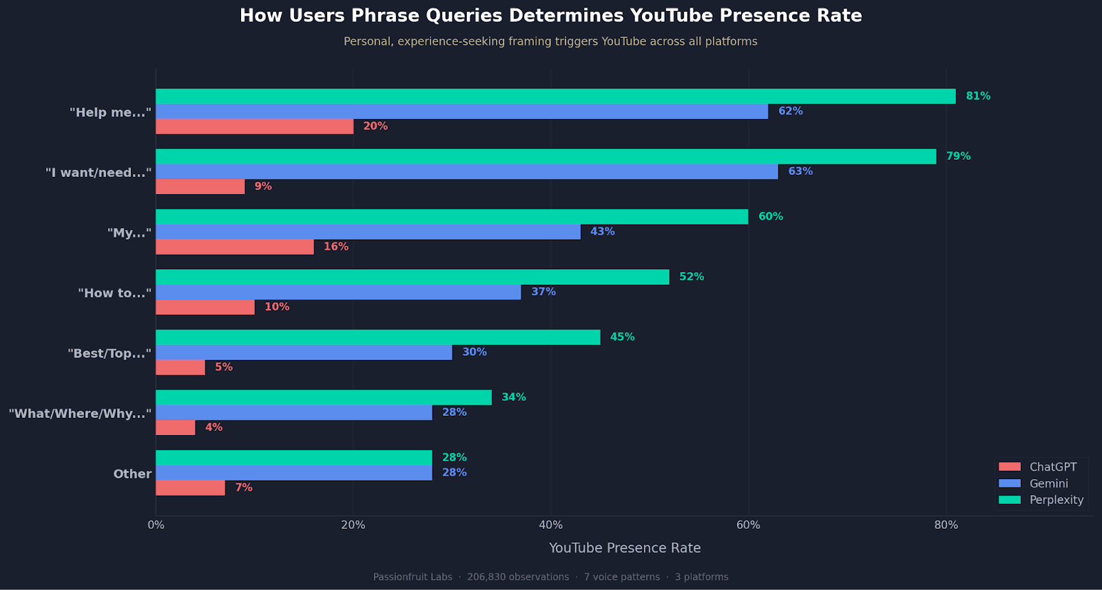 How users frame a question matters more than what they ask about. "Help me..." triggers a YouTube presence rate of 80.8% on Perplexity, 62.7% on Gemini, and 19.7% on ChatGPT. Even ChatGPT, which barely cites YouTube, triples its presence rate for "Help me" queries.