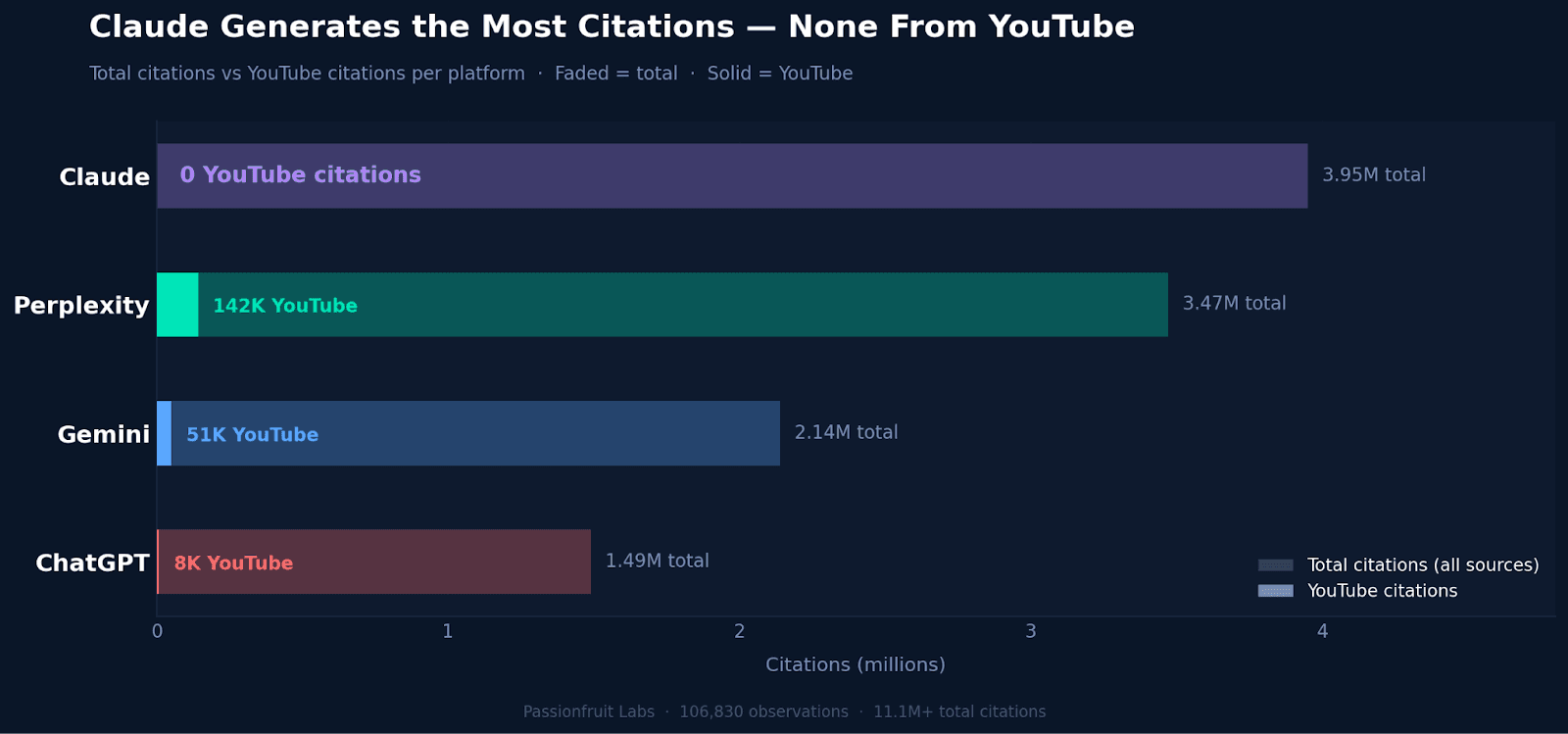 Claude never cites YouTube. Across all observations, it cited 3.95 million sources, none of which were YouTube. It generates the most citations of any platform in the dataset, all from non-video sources.