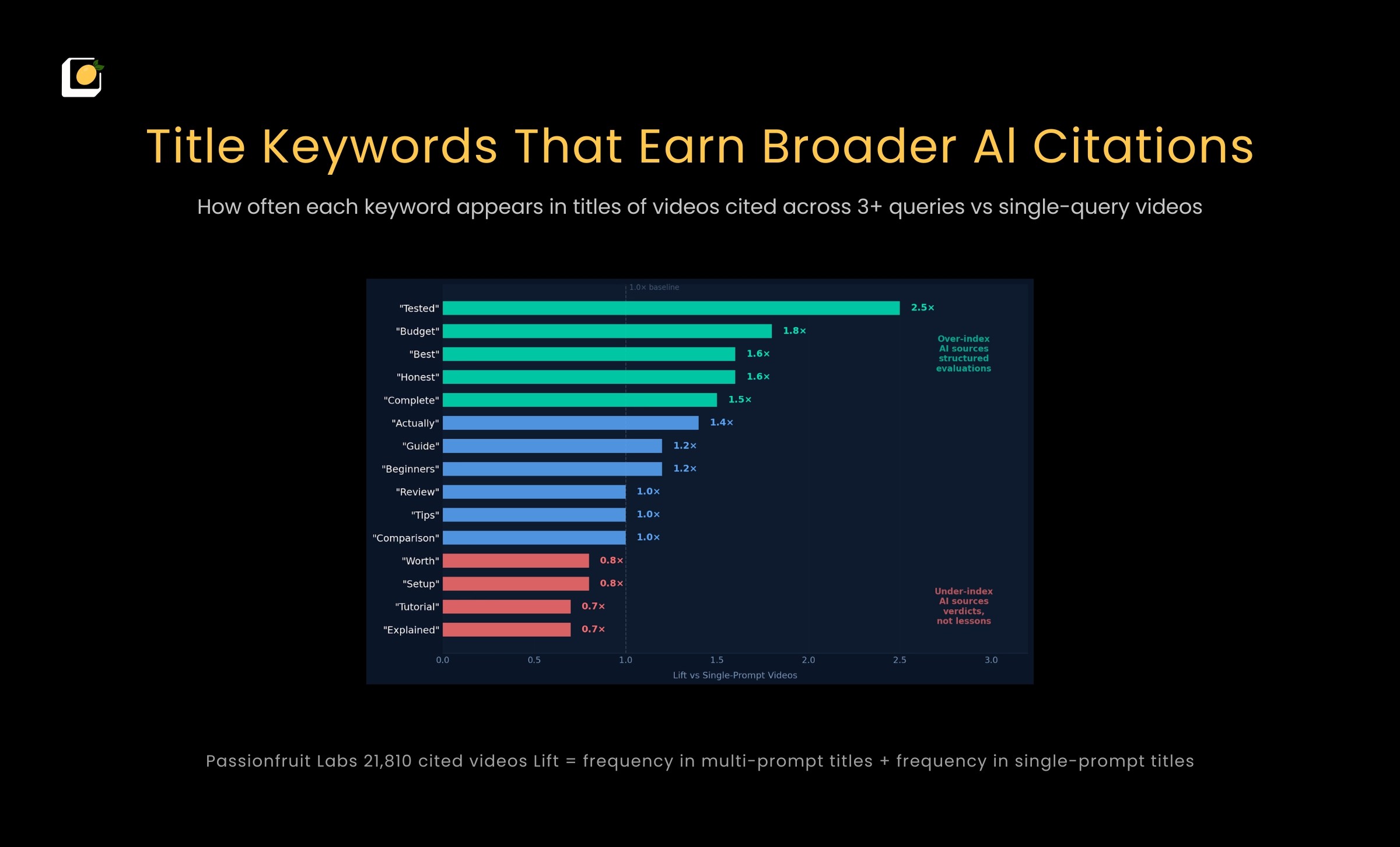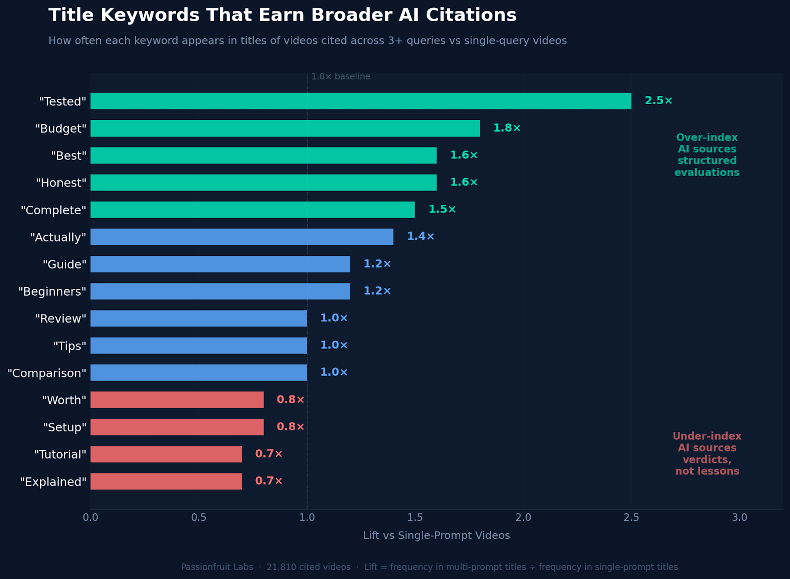 Videos titled "Tutorial" or "Explained" are actually less likely to get cited across multiple queries. Videos titled "Tested," "Budget," or "Best" are more likely. AI prefers content that evaluates and compares products over content that teaches how to use them.