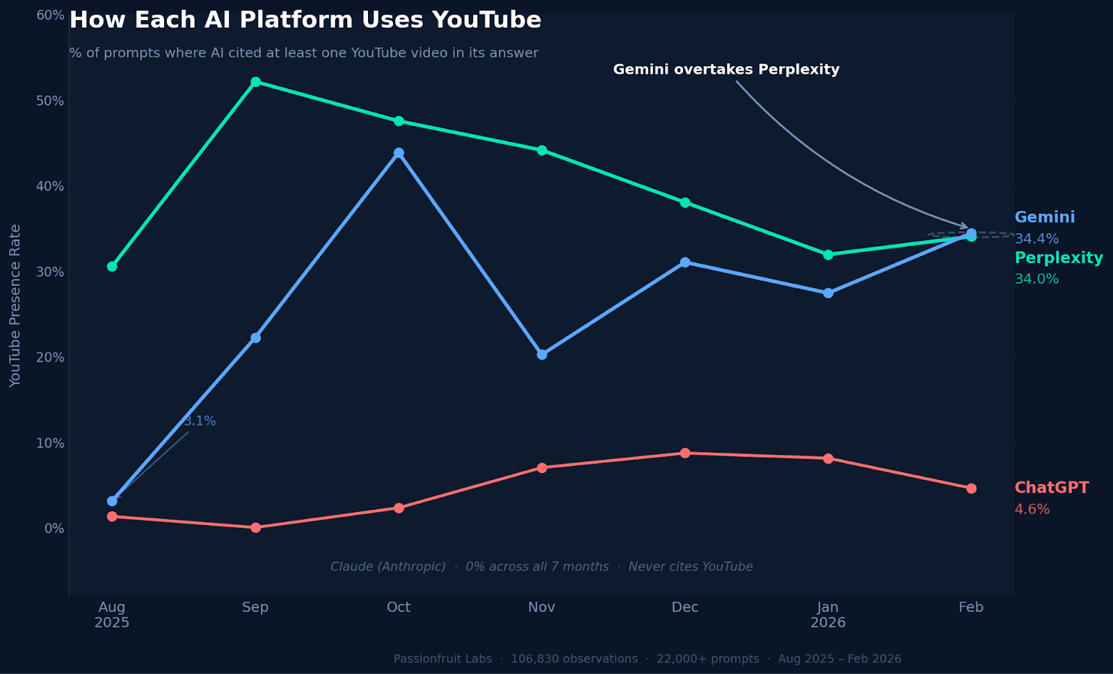 Gemini is catching up fast. Seven months ago, it rarely cited YouTube (3.1% of answers). By February 2026, it matched Perplexity at 34.4%. Gemini went from ignoring YouTube to treating it as a standard source in less than a year.