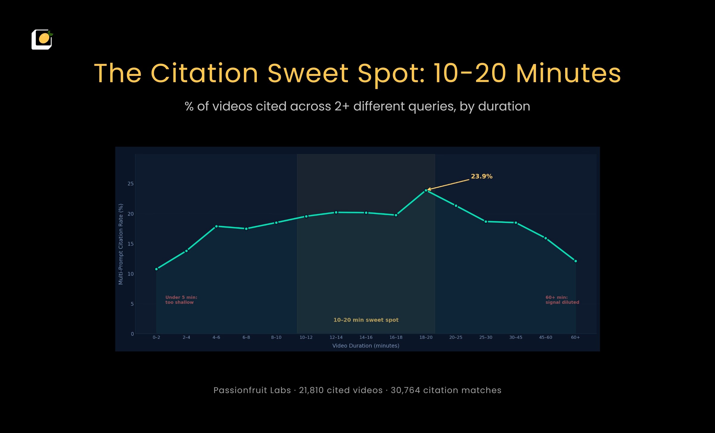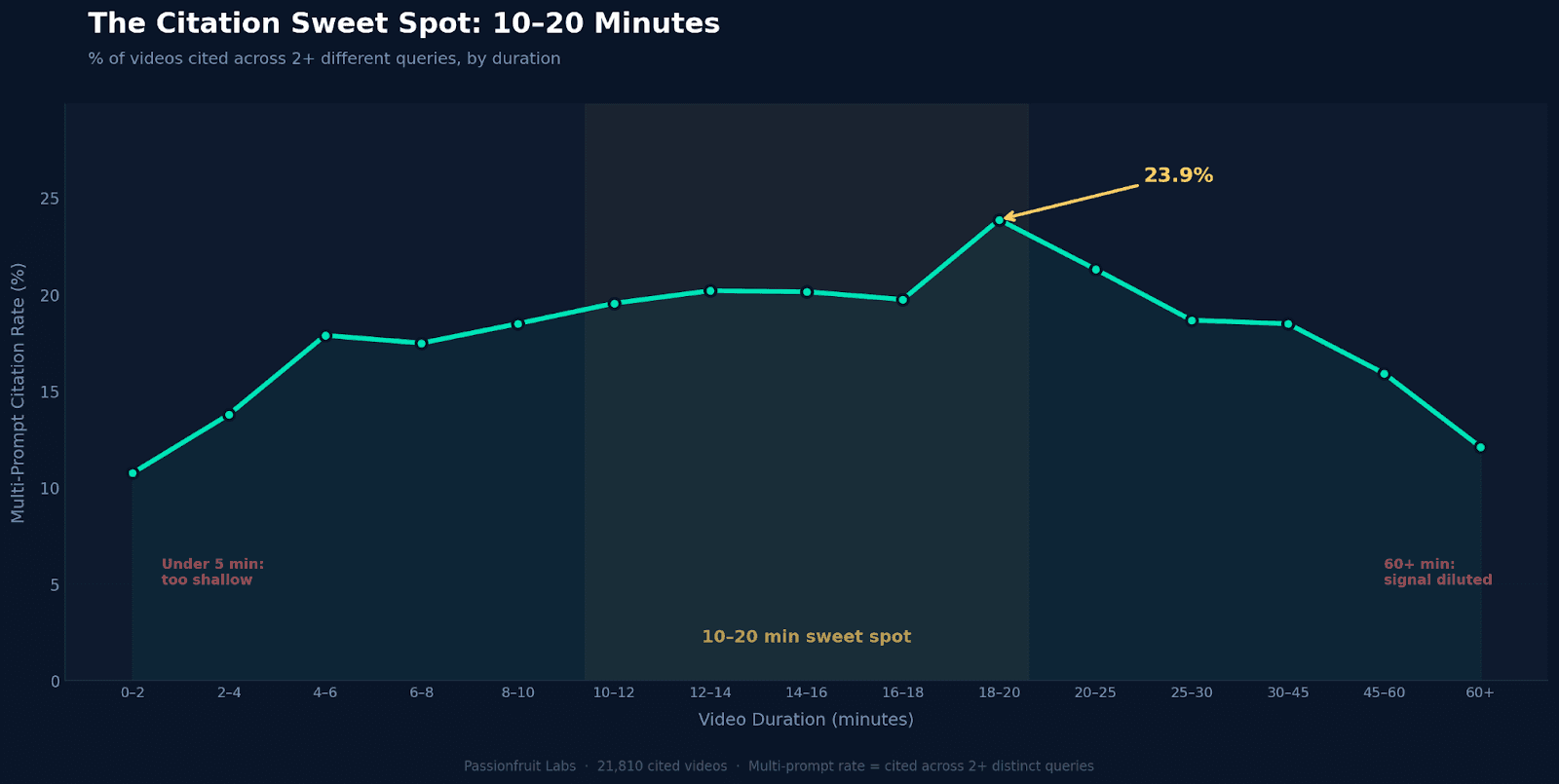 Under 5 minutes doesn't give AI enough to extract. Over 60 dilutes the signal with filler. Both ends perform at roughly the same low rate. The production target for your video to show up is 10–20 minutes. Long enough for depth, short enough that every minute carries information.