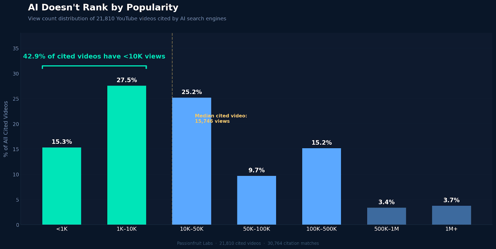 One channel, Savage Reviews, earned 170 citations from 6 videos averaging 3,055 views each. AI doesn't sort by popularity. It matches the content to the query.