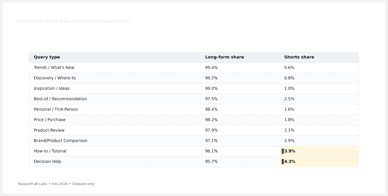 The highest Shorts penetration in any single query category is 4.3% (Decision Help). Across every category we analyzed, long-form video consistently outperforms Shorts for AI answers. Every dollar allocated to Shorts for AI search visibility performs better when redirected to long-form.