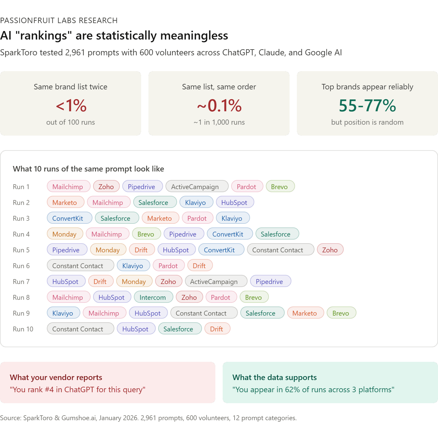 SparkToro & Gumshoe.ai (Jan 2026). AI Brand Recommendation Inconsistency Study.
