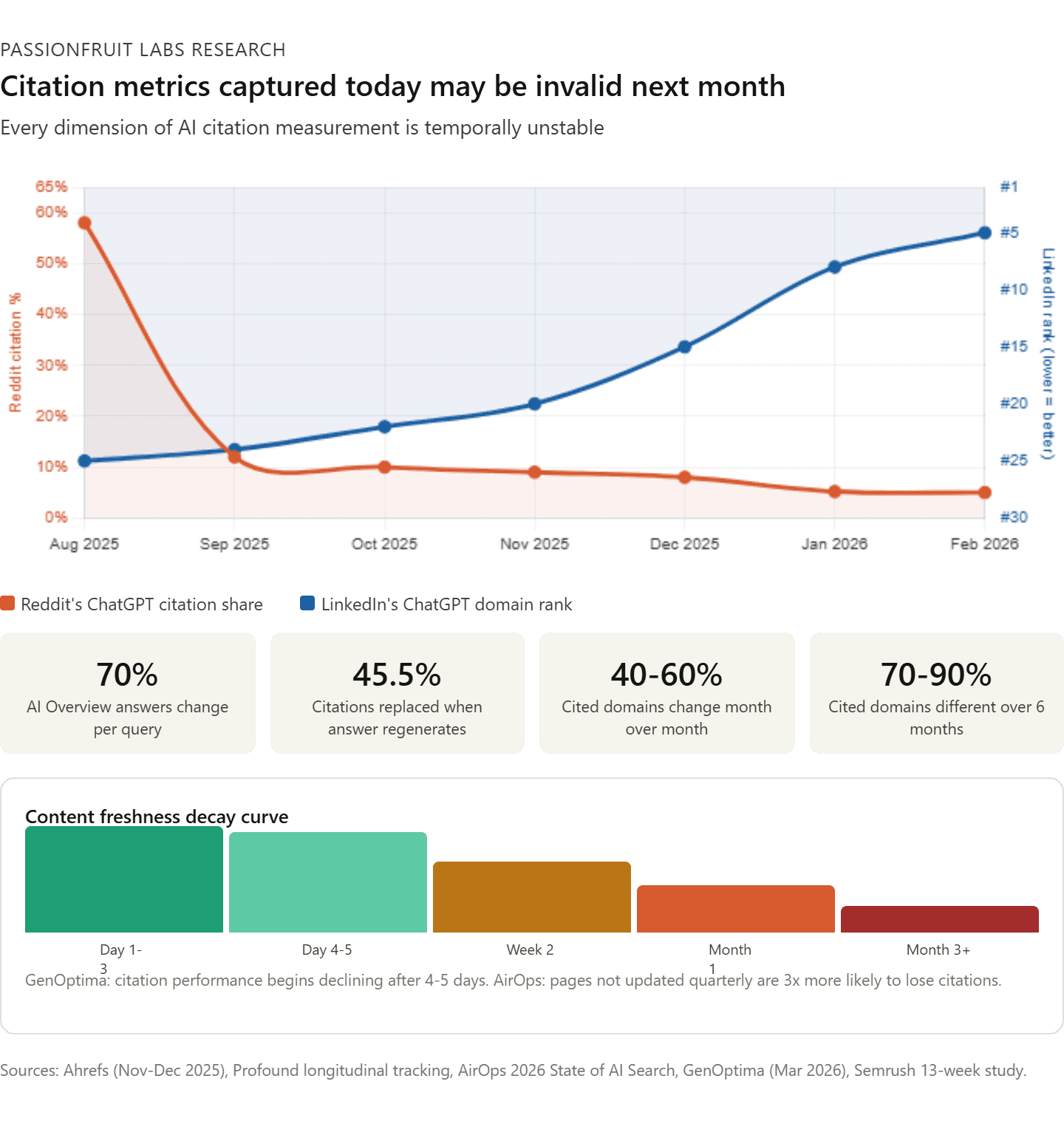 Profound's longitudinal tracking shows 40-60% of cited domains change month over month. Over six months, 70-90% of cited domains are completely different. AirOps found only 30% of brands remained visible between consecutive AI answers, and just 20% held presence across five consecutive runs. AirOps' 2026 State of AI Search report quantified the freshness requirement: pages that go more than three months without an update are over 3x more likely to lose visibility compared with recently refreshed pages. More than 70% of all pages cited by AI have been updated within the past 12 months.