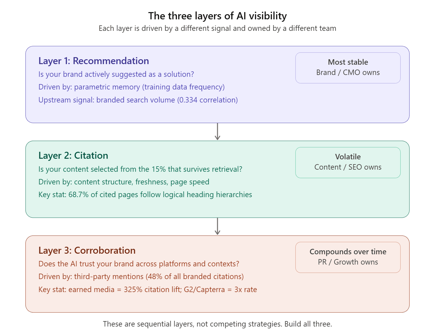 Brand authority determines whether the LLM recommends you at all (parametric memory). Content extractability determines whether your content gets selected from the retrieval set (only 15% of retrieved pages make the cut). Earned media determines whether the AI has enough independent corroboration to trust your brand across different contexts and platforms.