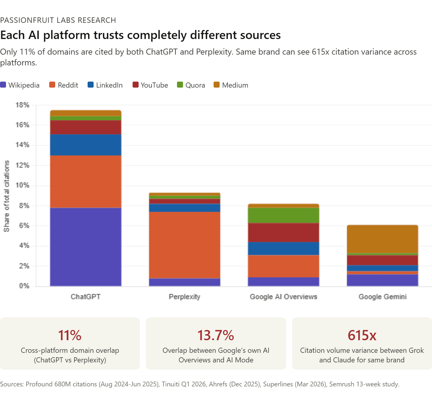 The cross-platform gap is massive. Only 11% of domains are cited by both ChatGPT and Perplexity (Ahrefs). Even within Google's own products, only 13.7% of citations overlap between AI Overviews and AI Mode. Superlines' March 2026 data found the same brand can see citation volumes differ by 615x between Grok and Claude. This is not a rounding error. It is a structural feature of how different AI architectures select sources.