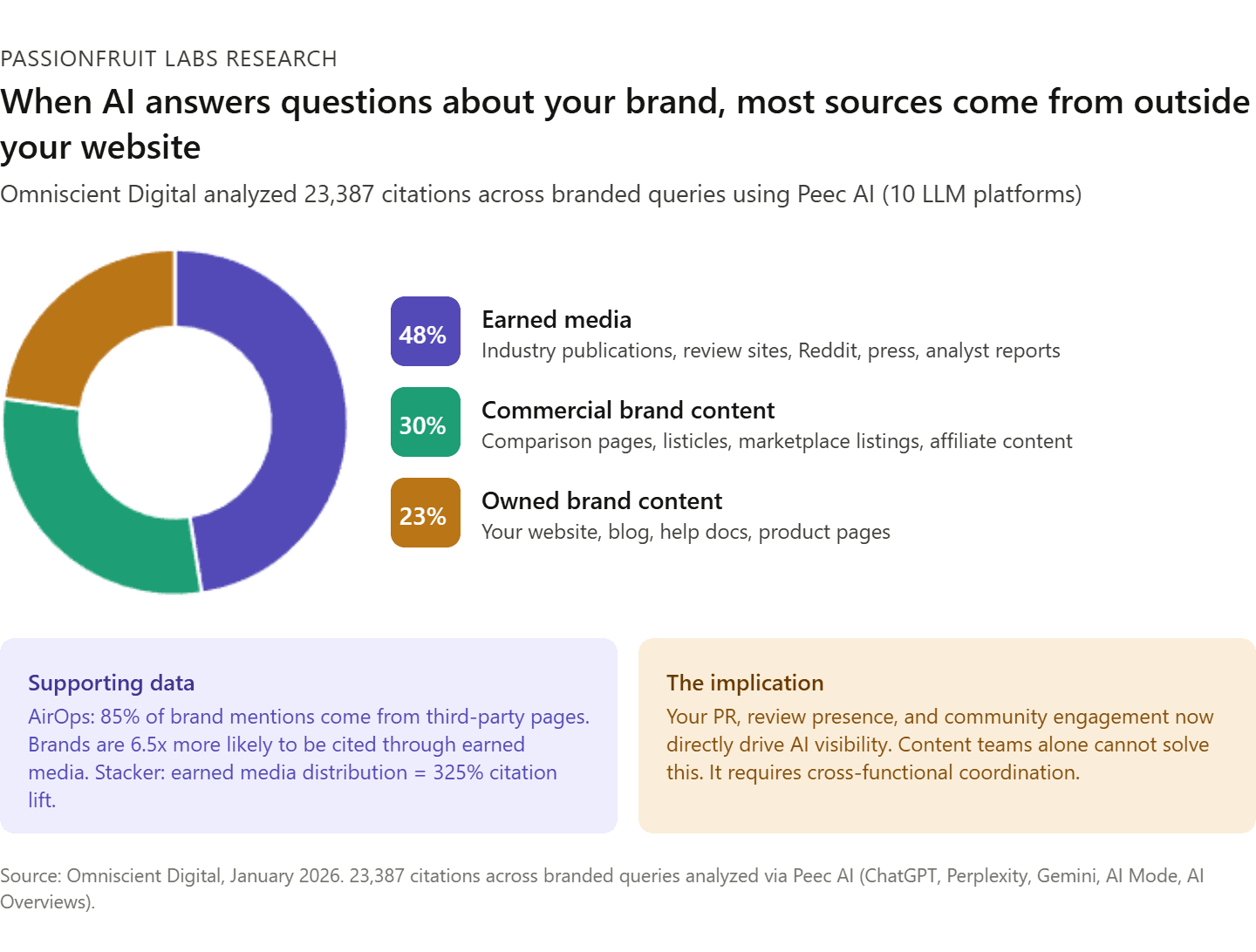Where citations actually come from: the Omniscient/Peec AI analysis: Omniscient Digital analyzed 23,387 citations across hundreds of branded queries using Peec AI (which tracks 10 LLM platforms and distinguishes between content that was "used" to inform an answer versus content that was explicitly "cited" with a URL). For branded queries, earned media sources account for 48% of all citations, commercial brand content makes up 30%, and owned brand content holds just 23%. When someone asks an AI about your brand, most of what it references comes from outside your website.