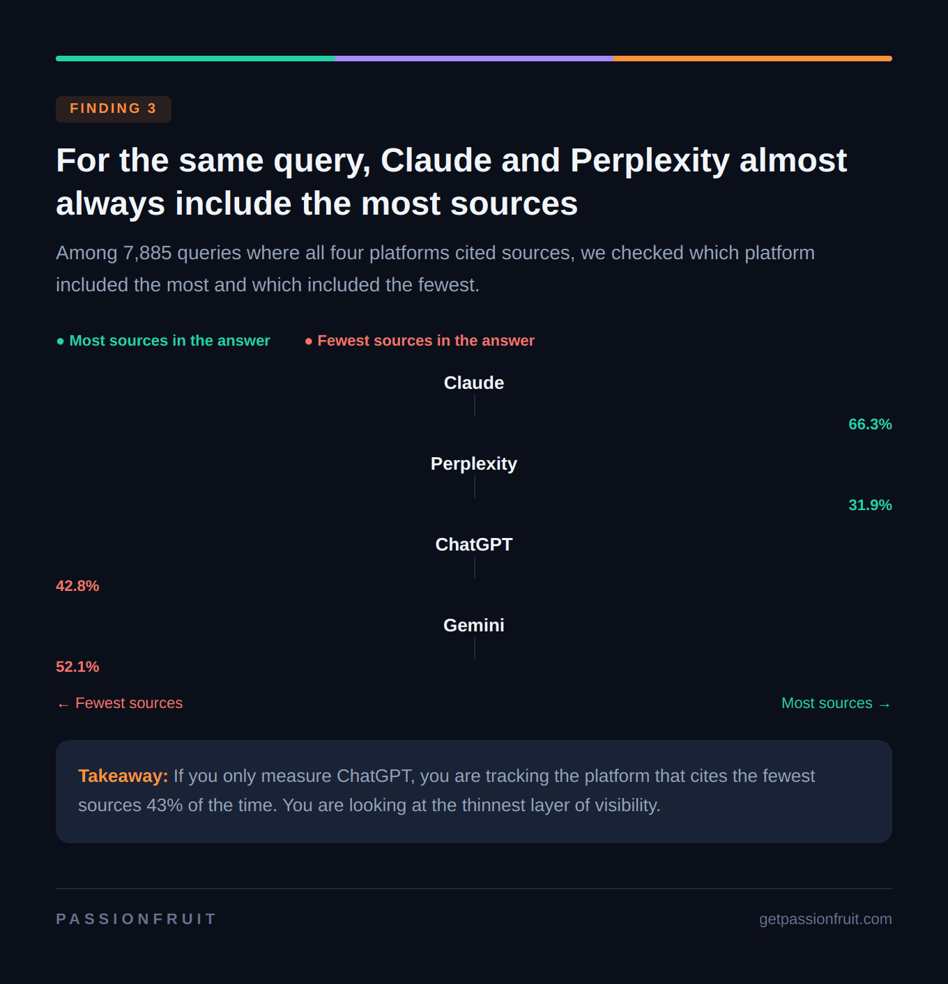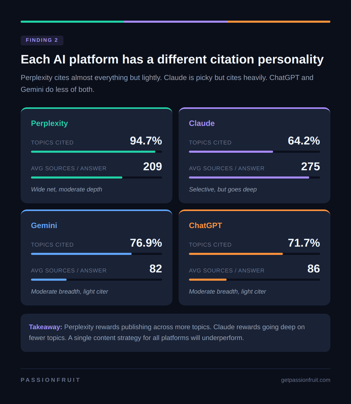 Stop tracking one platform and assuming it represents the whole picture. Perplexity and Claude generate the most citations but in completely different ways: one rewards breadth, the other rewards depth. ChatGPT and Gemini cite fewer sources per answer, making them easy to overlook even though they serve a large share of users. If you are only measuring one platform, you are flying with one eye closed.