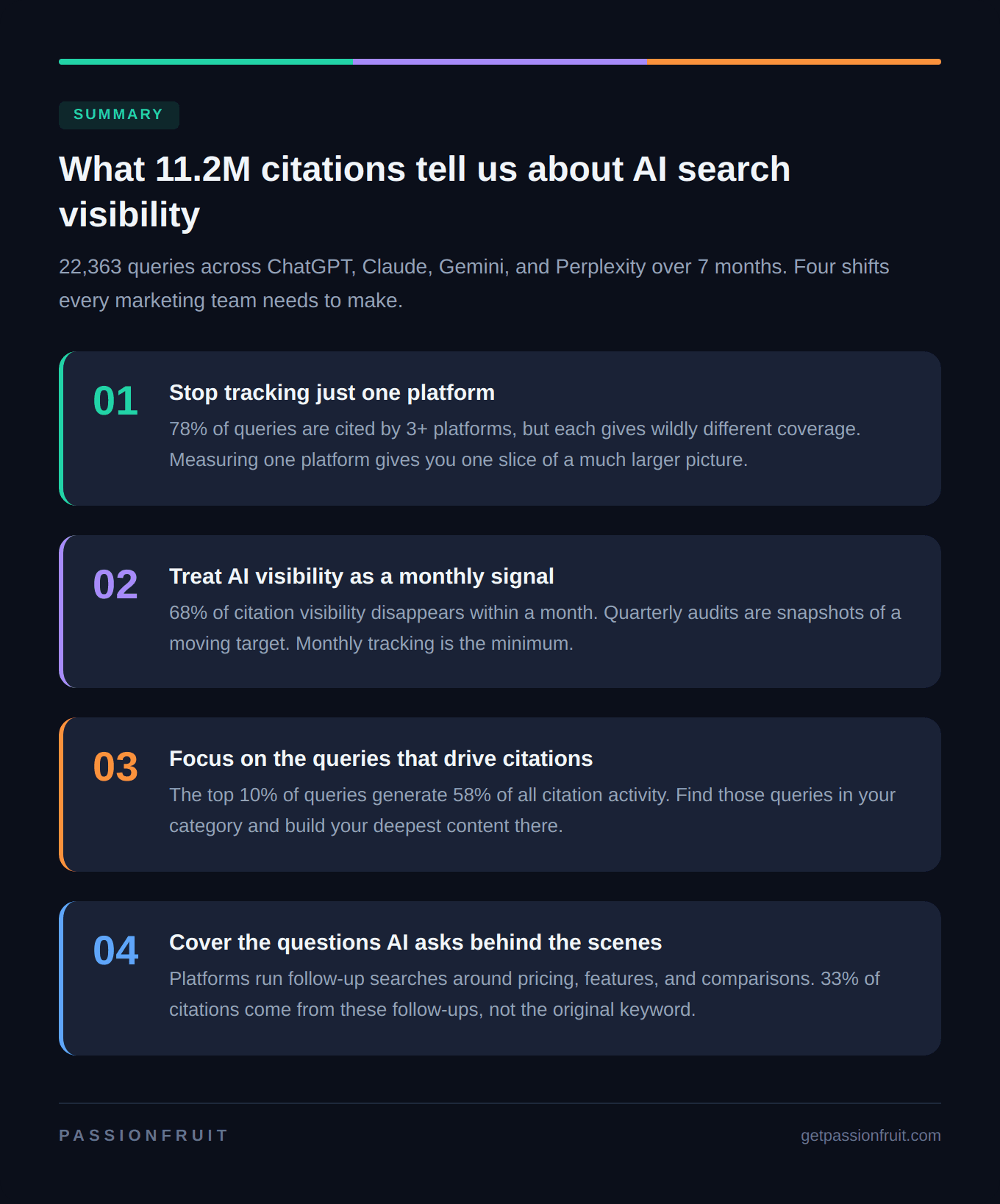 This analysis was conducted by Passionfruit, an AI-native SEO and generative engine optimization agency. The underlying dataset covers 22,363 queries tracked across four AI platforms over seven months, totaling 11.2 million citation events.