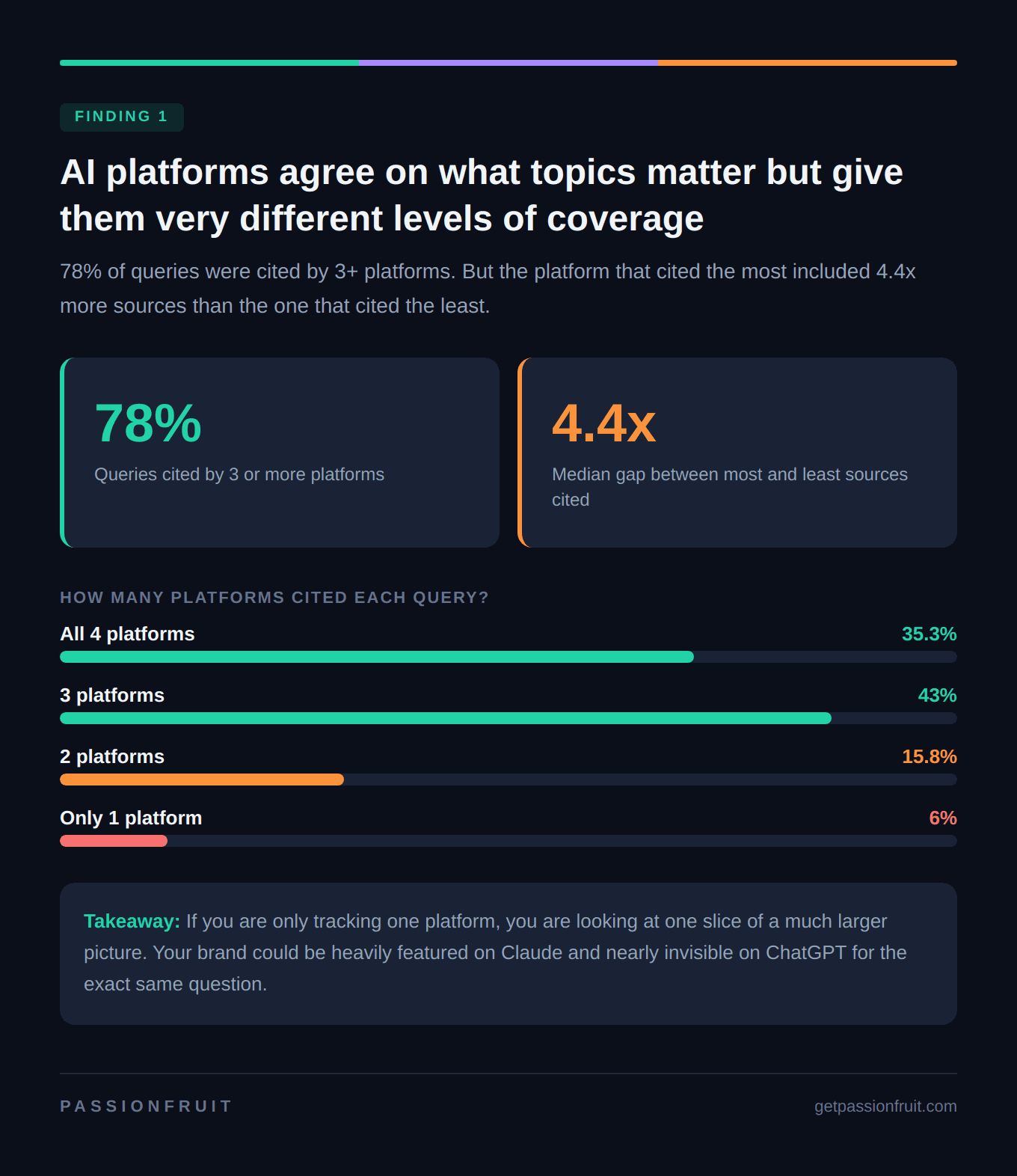 AI platforms mostly agree on what topics deserve sources in their answers, but they disagree wildly on how many sources to include. 78% of queries got cited by three or more platforms, but when all four platforms answered the same question, the platform that cited the most included 4.4x more sources than the one that cited the least. Your brand could be heavily featured on one platform and nearly invisible on another for the exact same question.