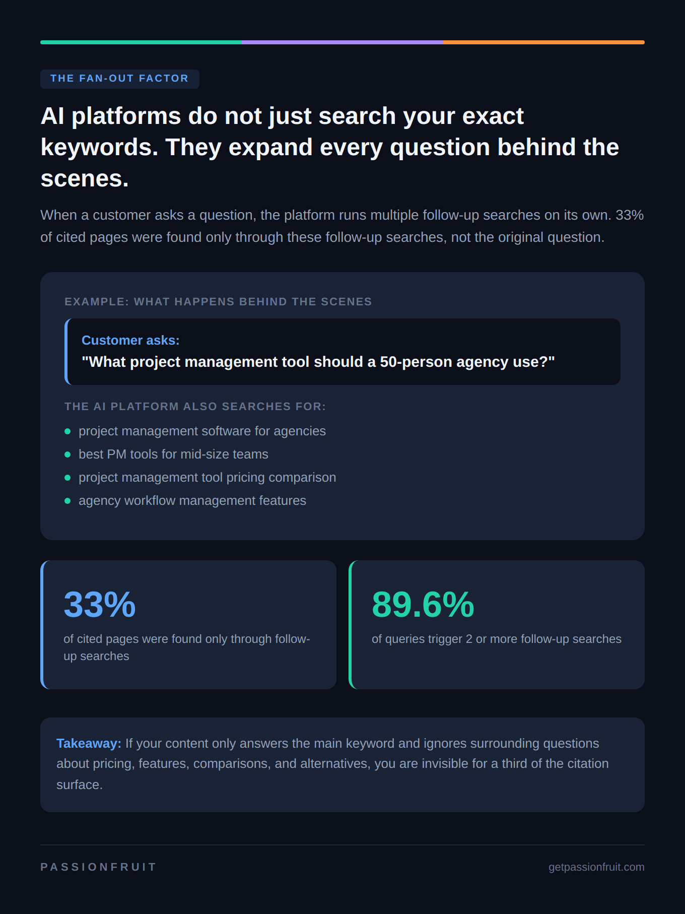 Account for how AI platforms expand your customers' questions behind the scenes. When someone asks an AI platform a question, the platform does not just search for those exact words. It generates follow-up searches around pricing, features, comparisons, and related topics, and a third of citation opportunities come from those follow-up searches alone. If your content only covers the primary keyword and does not address the surrounding questions, you are invisible for a significant share of the citation surface. Build content that answers not just the main question but the related questions your customers would naturally ask next.
