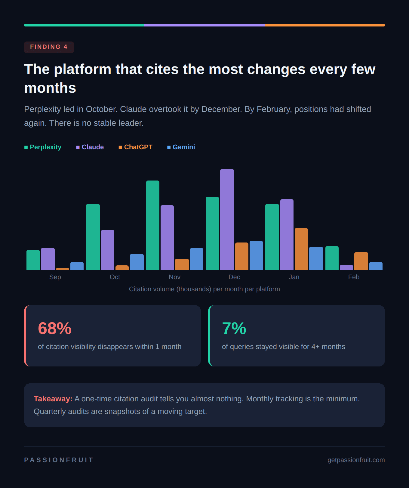 This volatility was consistent across platforms. Every platform showed high month-to-month fluctuation, including ChatGPT, which was the most stable of the four but still showed substantial swings.