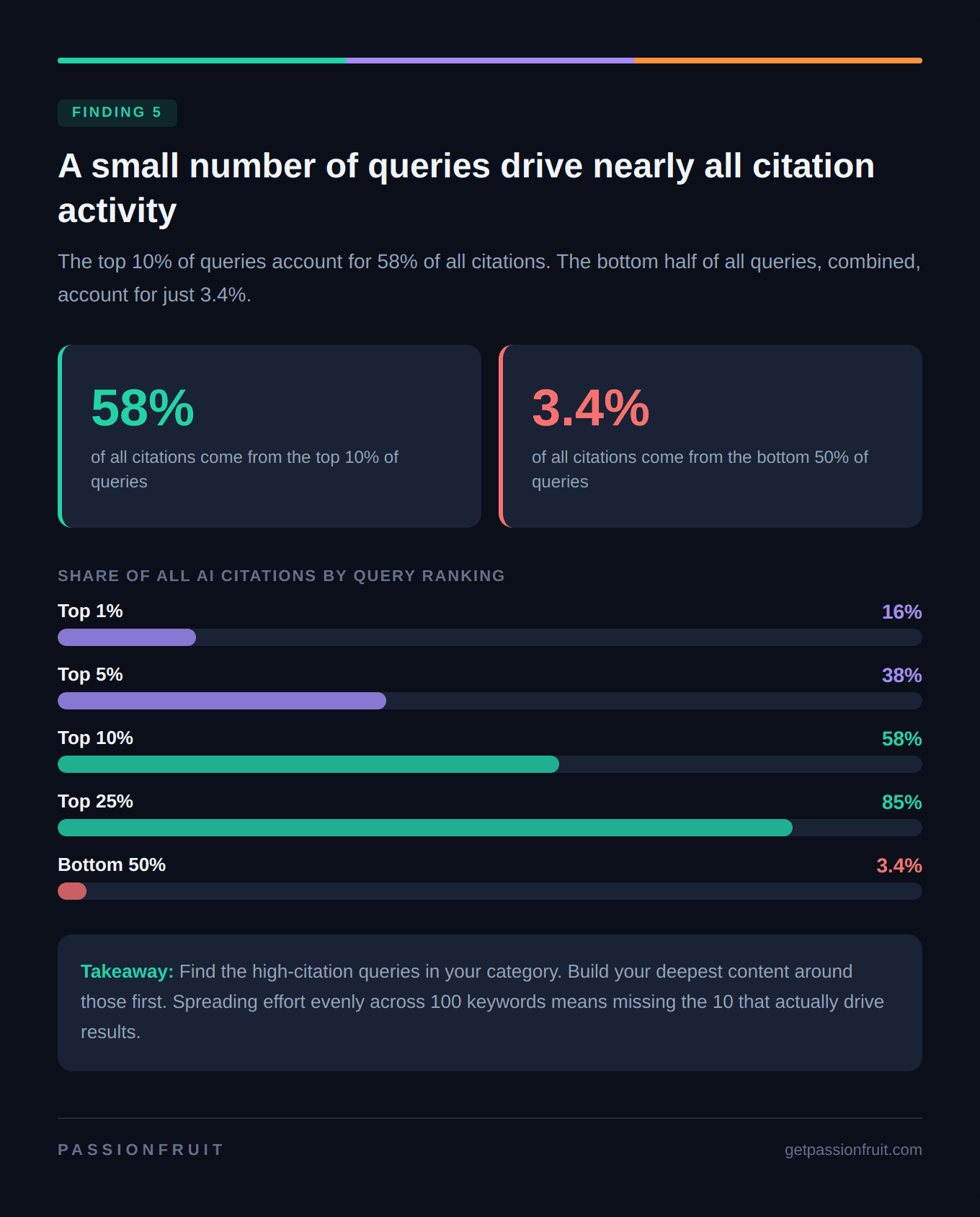 Think about what that means practically. If your team is spreading content effort evenly across 100 target queries for AI search, roughly 10 of those queries are generating the vast majority of all citation activity, and the other 90 are contributing almost nothing to your overall visibility. The math overwhelmingly favors finding and owning those top queries rather than trying to cover everything.